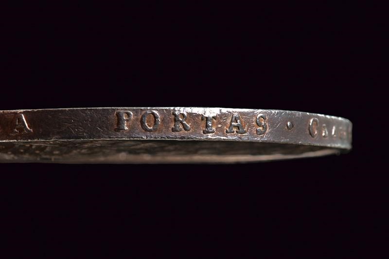 Made of silver-plated bronze. On the obverse, an armoured bust (right) with wig and scarf, on the borders "FREGI ALPES, GALEISQVE / PADVM VICTRICIBVS HAVSI. CLAUD"; in exergue " EVGENIVS SAB: PRINC: SVPR: EXERCIT: CÆS: IN ITAL: DVX.". On the reverse, view