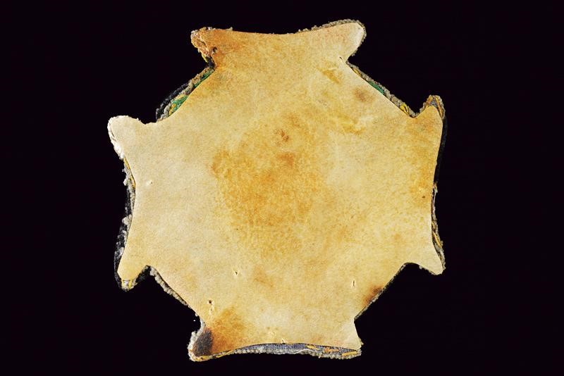 Stitched plaque in polychrome, threads and with paillettes. Covered with leather on the back side. Probably a post-war production.