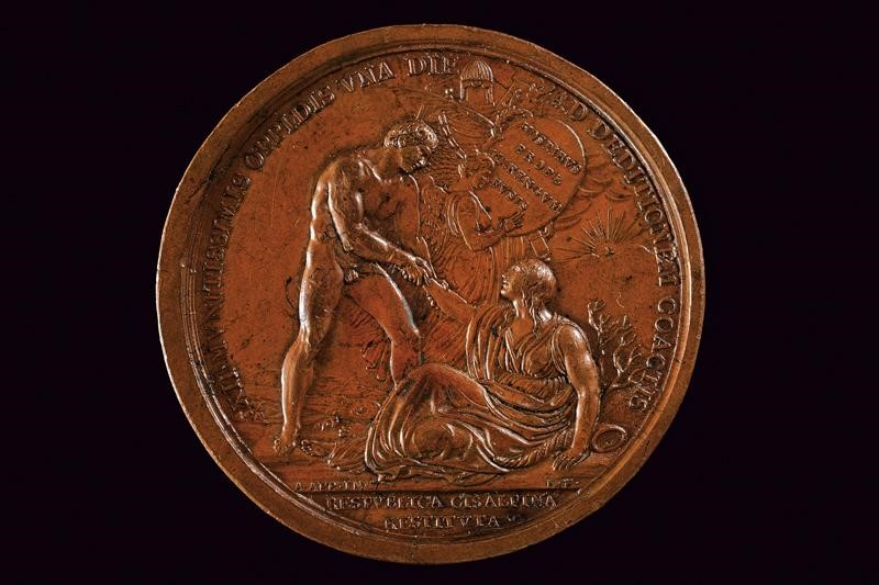 Made of bronze, for the Battle of Marengo and the restoration of the Cisalpine Republic. On the obverse, bust (left), on the border "BONAPARTE PRIMVS CONSVL / ANNO VIII"; opus "LAVY". On the reverse, Hercules raises the Cisalpine Republic and Victory writ