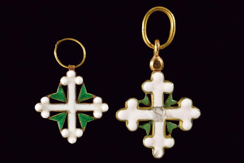 Two miniature knight's crosses. Made of gold and enamel. The smaller cross with tiny missing parts. The larger one with several chips, the ring with marks.