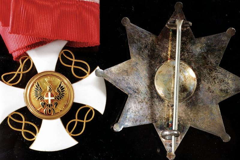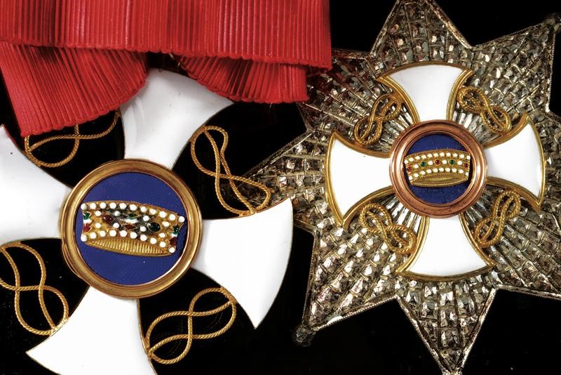 Commendatore's set. The gold pendant with enamel, complete with neck ribbon. Diamond-like, silver plaque with gold and enamel order. Vertical pin on the back side.