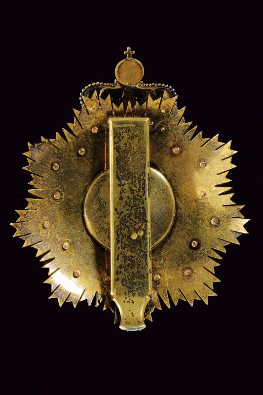 Grand Cross plaque of gilded and enameled silver, the medallion in gold, beautiful pierced crown with enameled base. On the back side, large vertical pin with two clearly visible marks. Rare.