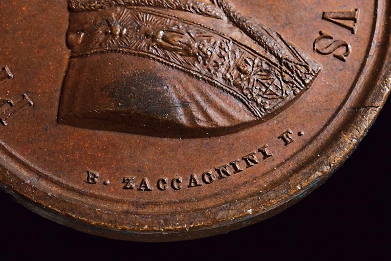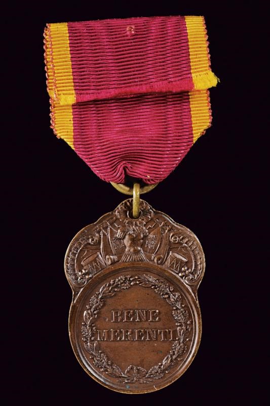 On the obverse, bust (right) with inscription "PIVS IX PONTIFEX MAXIMUS", opus B. Zaccagnini. On the reverse "BENEMERENTI" in laurel wreath. Above military trophy. With ribbon. To military merit for the fighters of the papal troops to maintain the power o