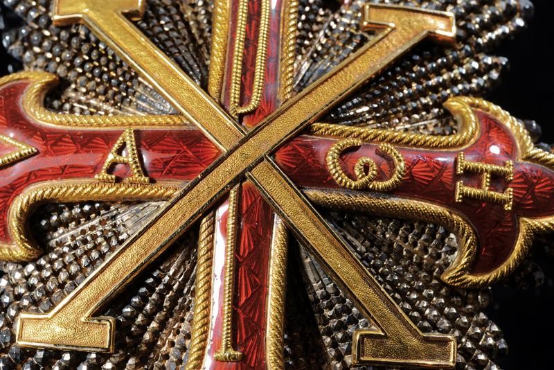 Plaque of the Grand Cross made of diamond-like pierced silver. The center made of gold and red enamel. Marked "No. 42 LEMAITRE RUE COQUILLIERE FABRIQUE D'ORDRESFRANCAIS ET ETRANGERS PARIS" on the back. Vertical pin and two side hooks. Of excellent manufac