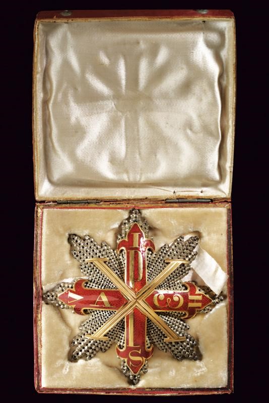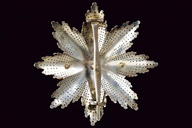 Plaque of the Grand Cross made of diamond-like pierced silver. The center made of gold and red enamel (small chips). On the reverse side a vertical pin with two marks. In a contemporary case marked in gold "Jgnace Jos. Schmidt BIJOUJIER DE LA COUR Impéria