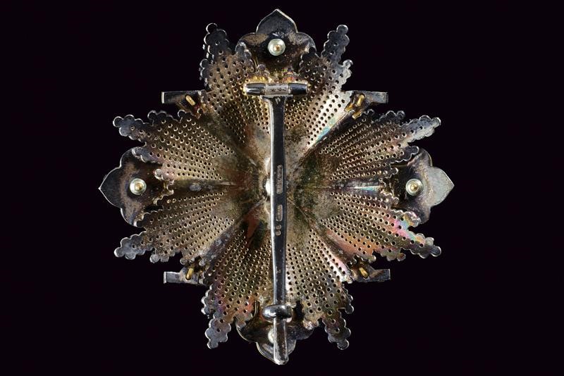 Plaque of the Grand Cross made of finely pierced silver, the centre made of gold and with red enamel. On the reverse side a vertical pin marked ‘C.F. ROTHE’, ‘WIEN’ and ‘A’.