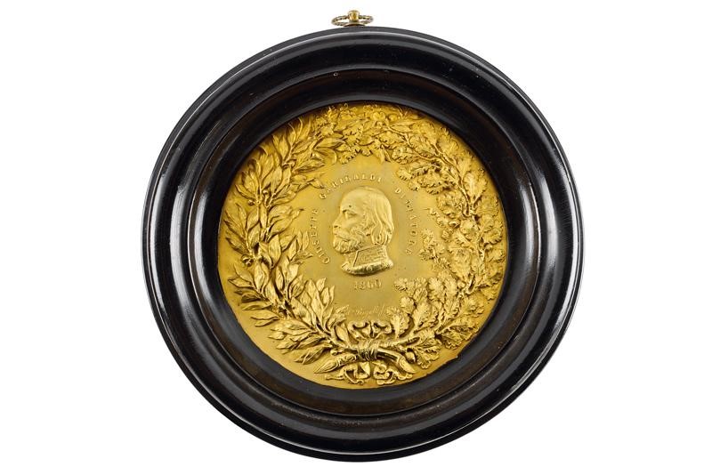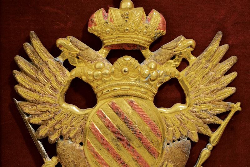 Made of gilded metal (missing parts) and partially painted red. In the centre of the imperial eagle an oval coat of arms with alternating oblique bands in gold and red. On red velvet and in a contemporary stuccoed and gilded wooden frame (minor missing parts). Very decorative.