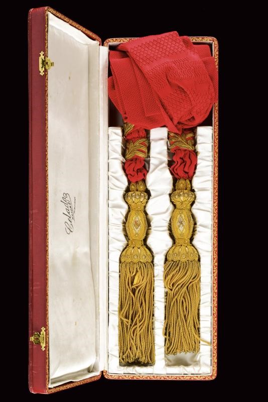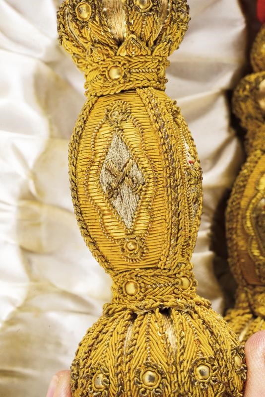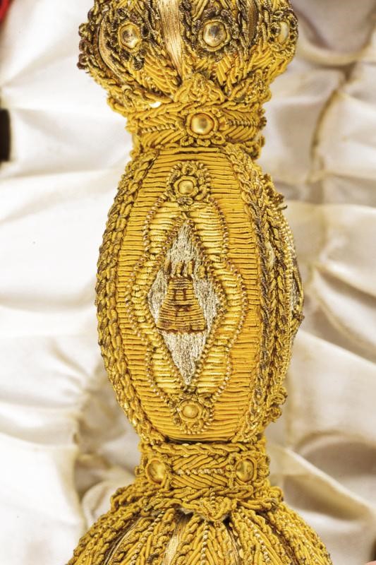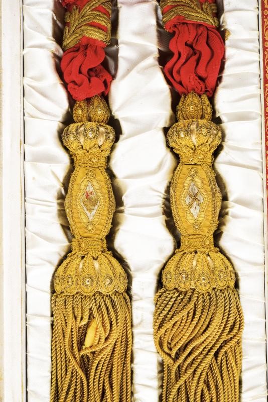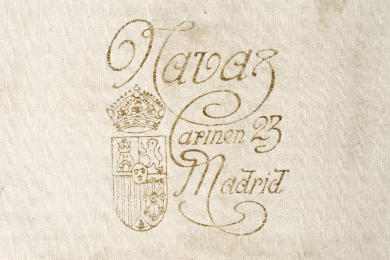 Made of purple silk lined with white silk, with the Spanish royal coat-of-arms at the center, another coat-of-arms with two towers and two crosses (an order badge mark?), all made of gilded threads and red and light-blue silk. Stamp of a tailor from Madrid. In a case.