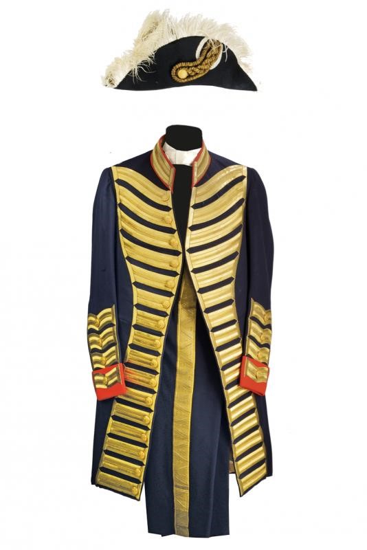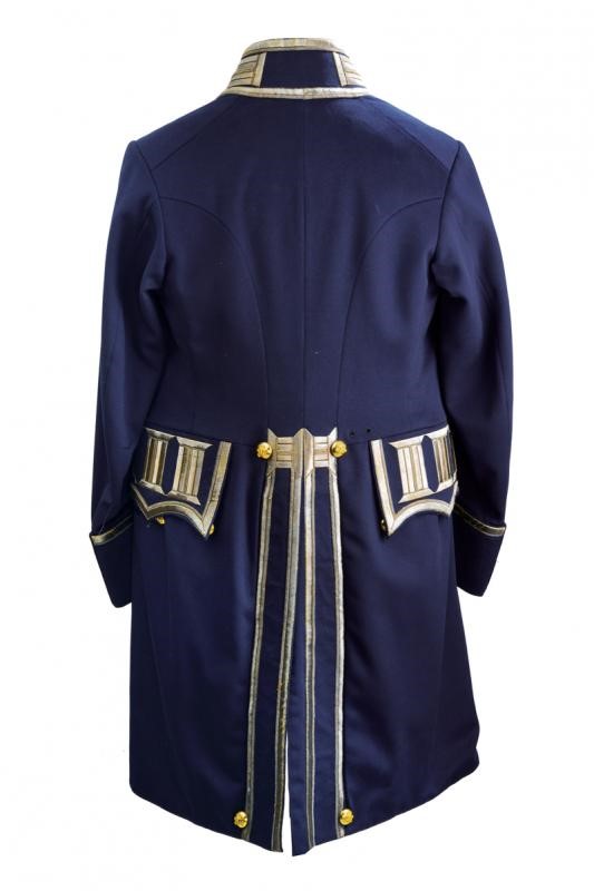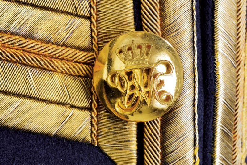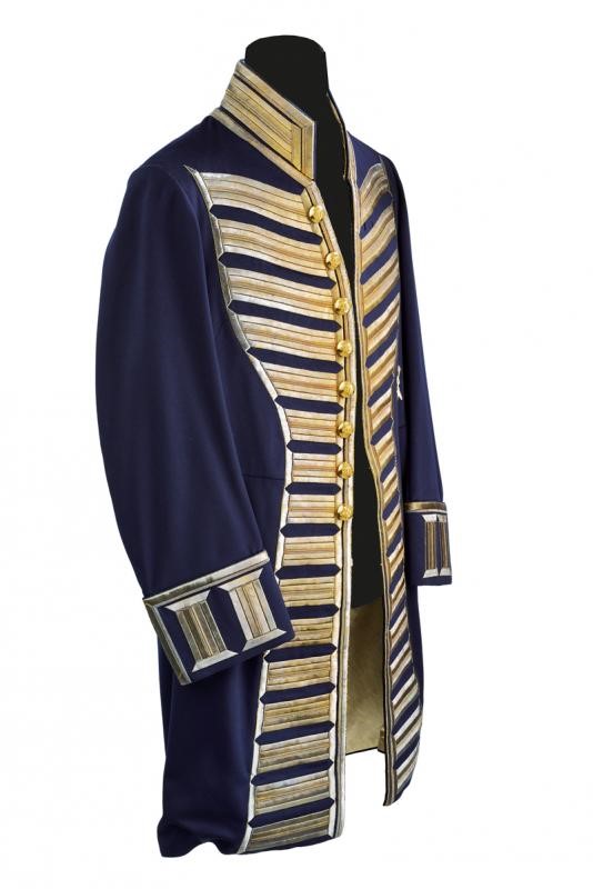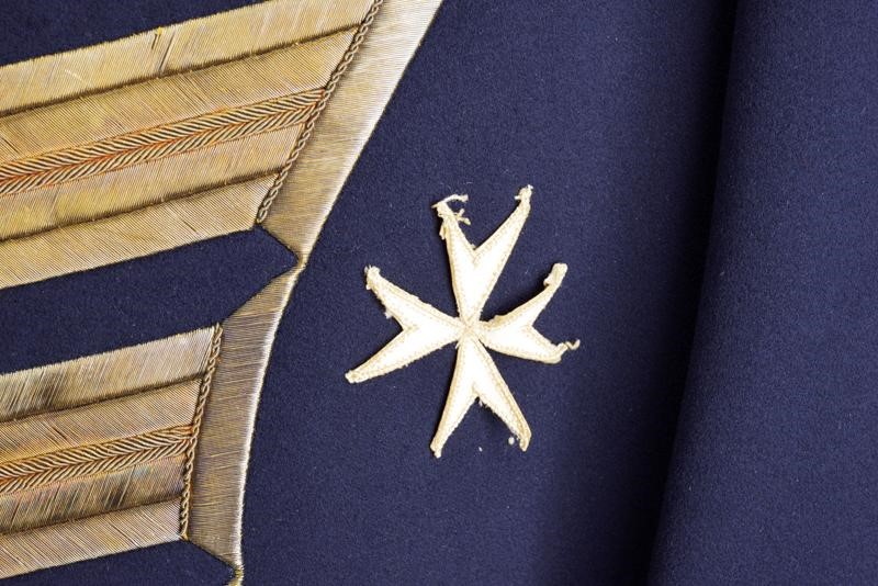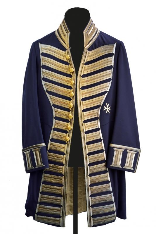 Made of beautiful, midnight-blue fabric richly decorated with gilded threads. With gilded buttons provided with monogram 'FW' under crown, marked 'HOCHFEINE QUALITƒT', '22 FL' and 'M.' below. White silk Maltese cross sewn at the front. Lined with white silk.
