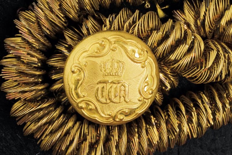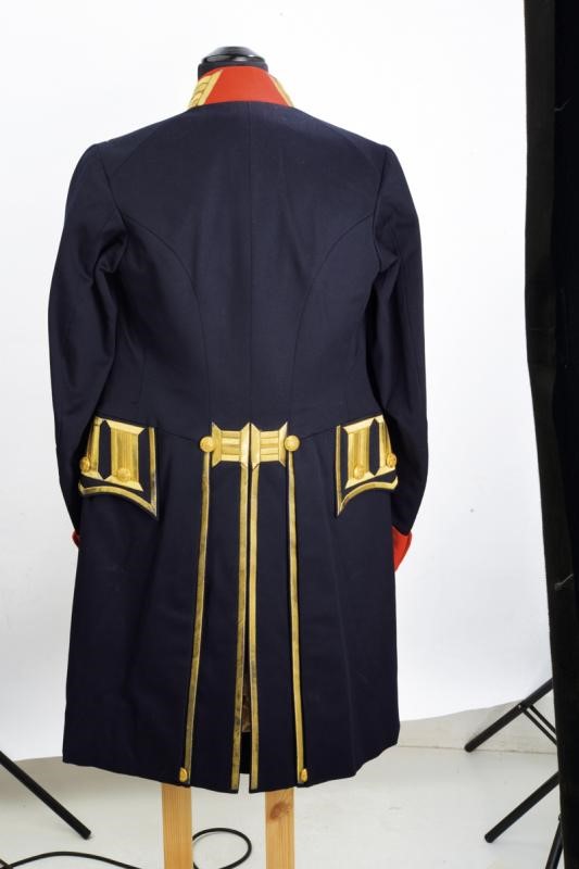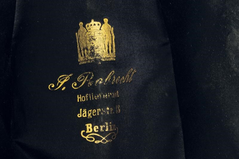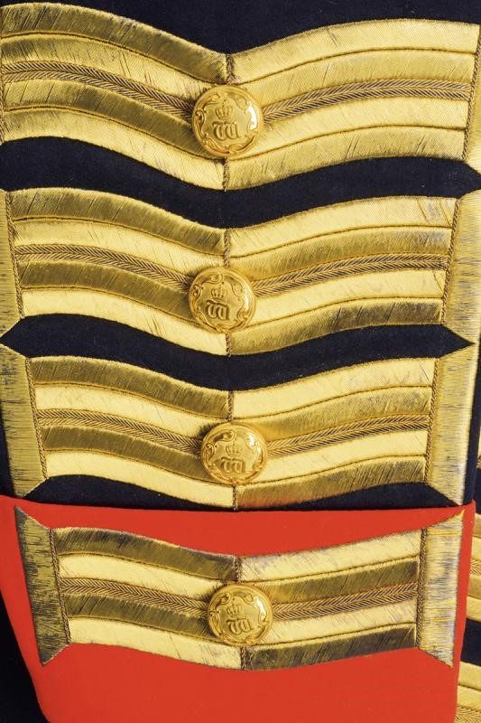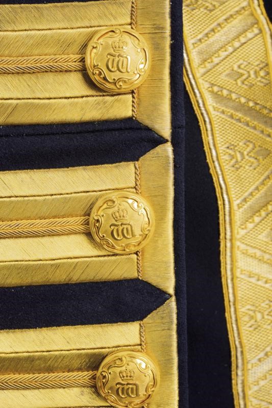 Black felt bicorn with white ostrich feathers, black silk lining with gold stamp of a court tailor from Berlin. Blue fabric tailcoat with red collar and cuffs, all richly decorated with gold threads, buttonholes for the ranks on the front. Gilded buttons with monogram 'W' under royal crown. White silk lining. Complete with blue fabric trousers with gold chevron.