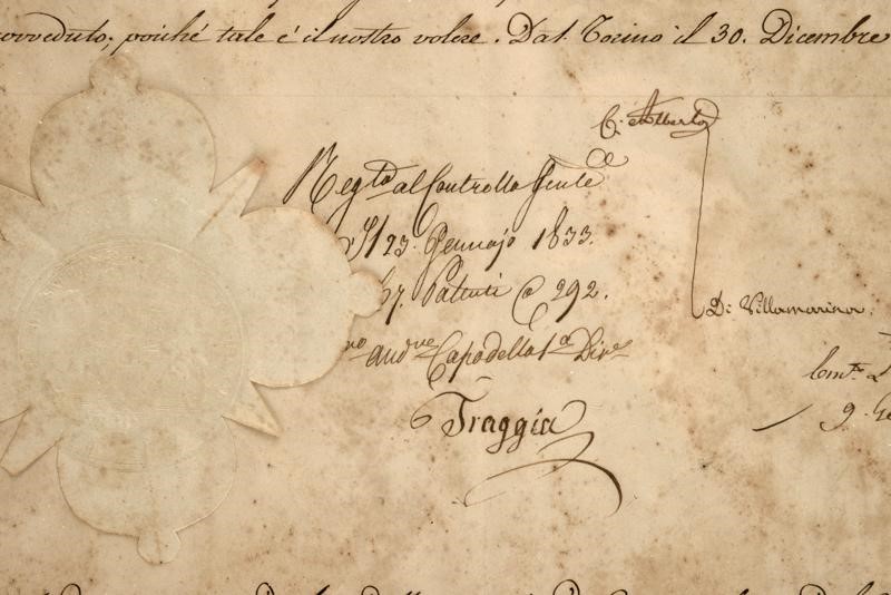 A decree appointing Count Amedeo Barberis of Branzola as Commissary of the Province of Cuneo, signed by King Charles Albert and dated December 30th 1832. Framed and under glass.