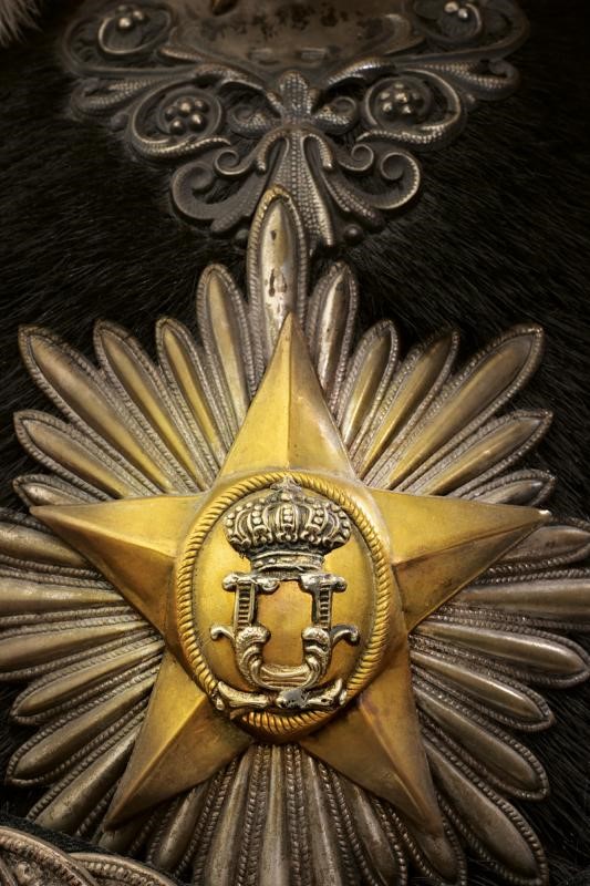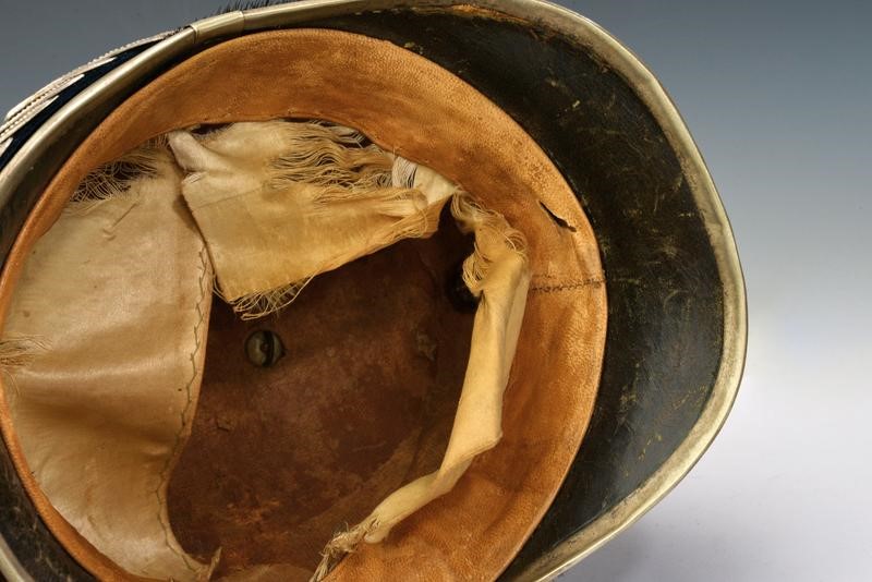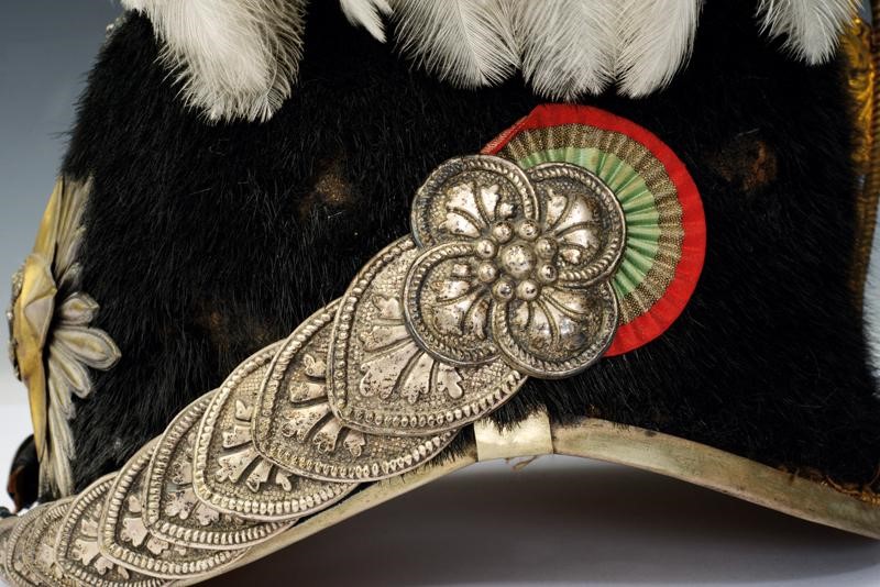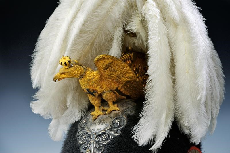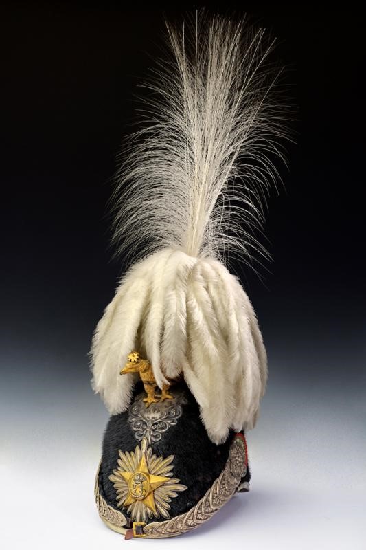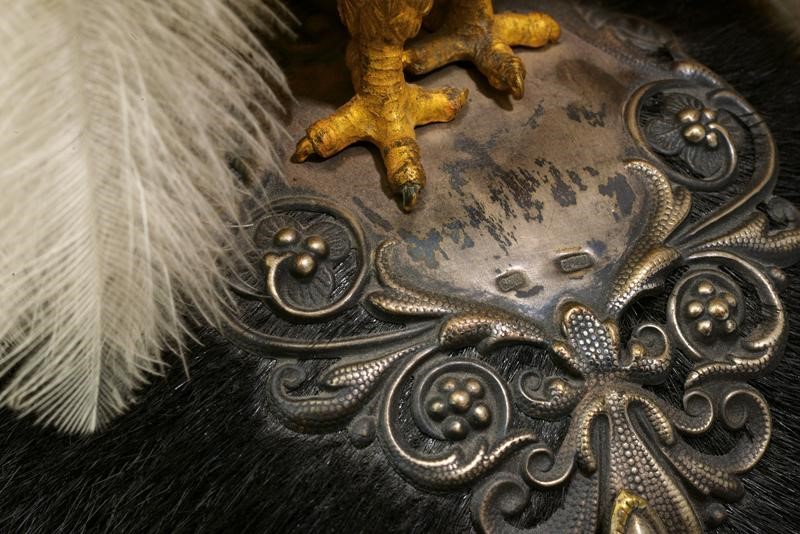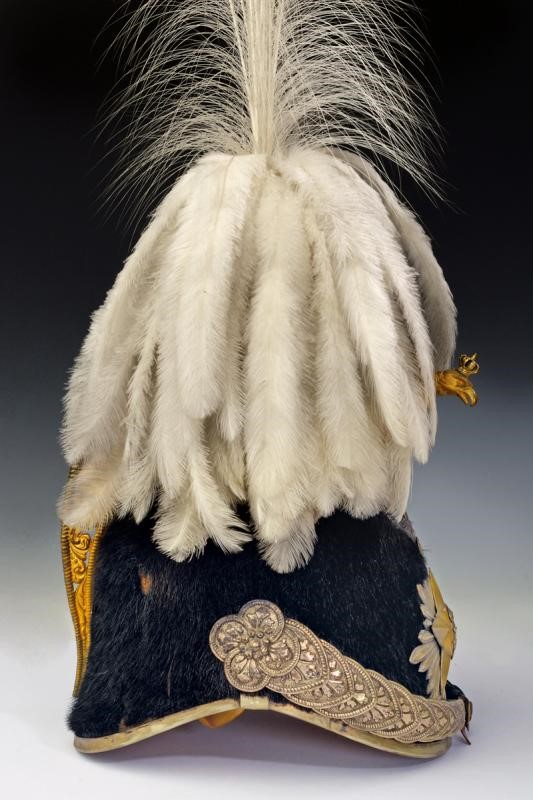 Metal skull covered with black fur (small missing parts); marked silver mounts, gilded crest (a small broken part easy to restore), gilded star featuring the crowned monogram "U", scaled chin-strap, brown Moroccan leather inside and remains of a silk cap. Complete with the very rare aigrette and heron feather. Very rare.