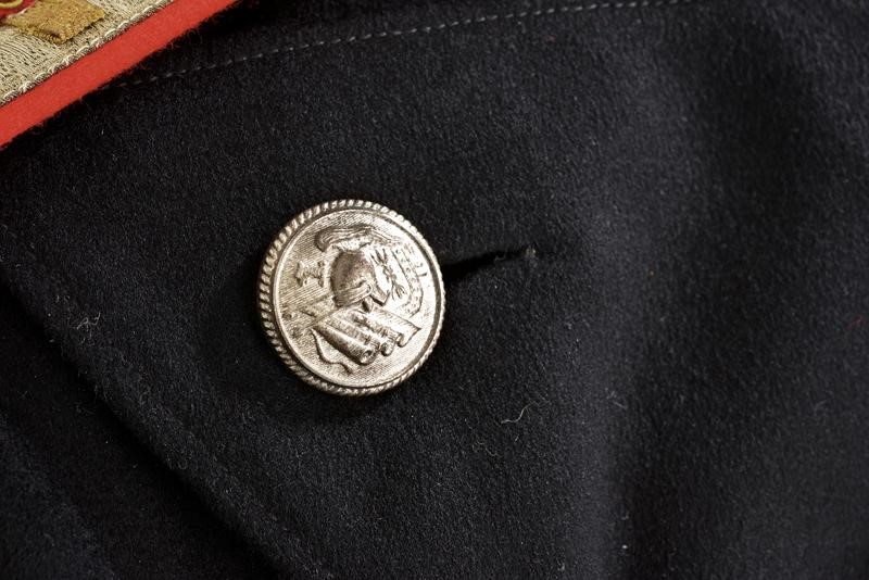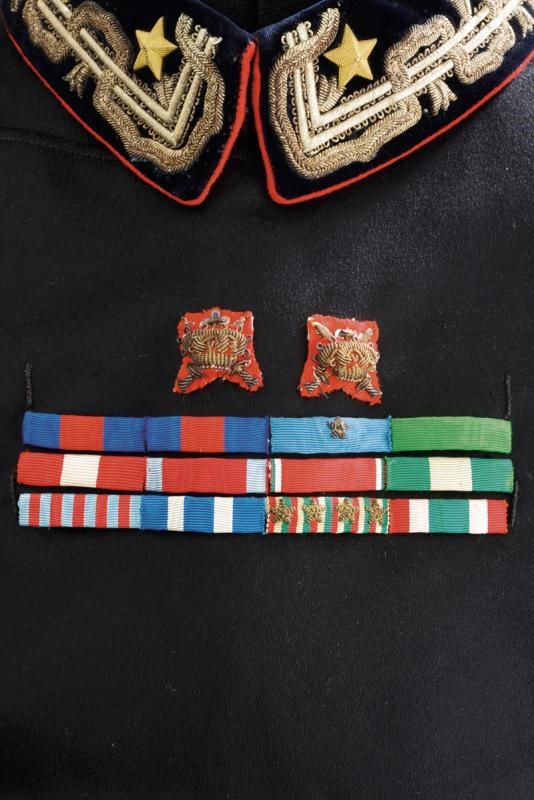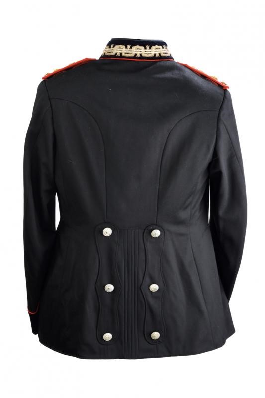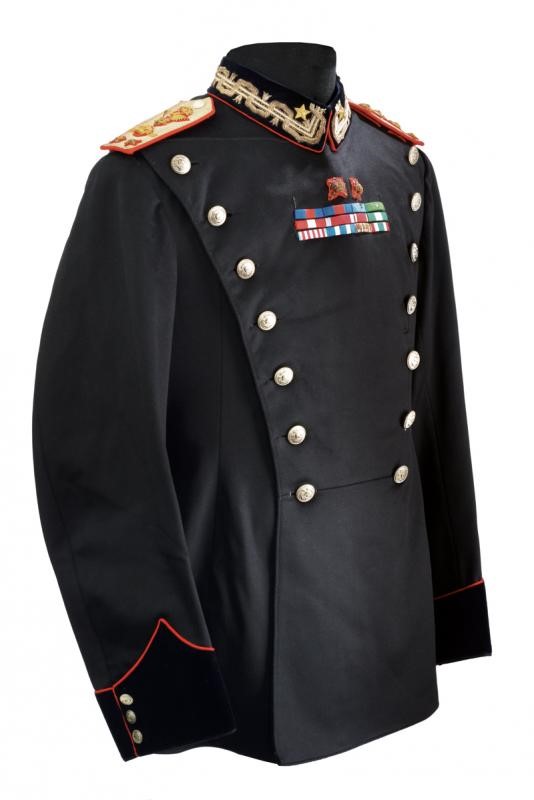 Made of fine black cloth with velvet collar and cuffs featuring red piping, the collar featuring gilded-thread ranks and gilded-metal stars. The shoulder boards with gilded-thread embroidery on silver chevron. The front side with three rows of ribbons and two threaded stars for Battlefield promotion. Silver-plated buttons. Black fabric lining with label "MILITARY UNION". Rare.