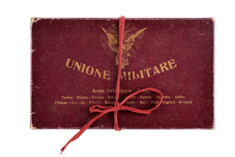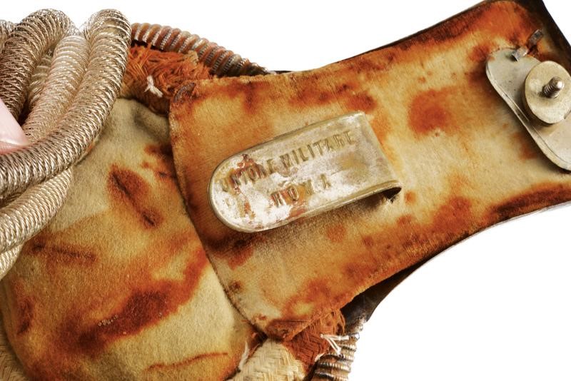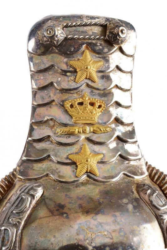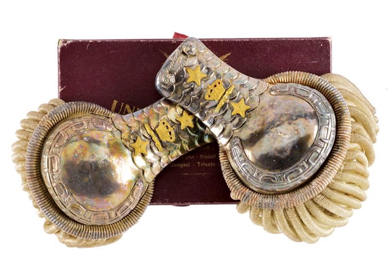Made of silver with two stars, crown on a gilded band, silver-thread fringes, lined with white fabric (stained) and marked "UNIONE MILITARE ROMA". In their original case. Rare.