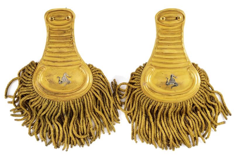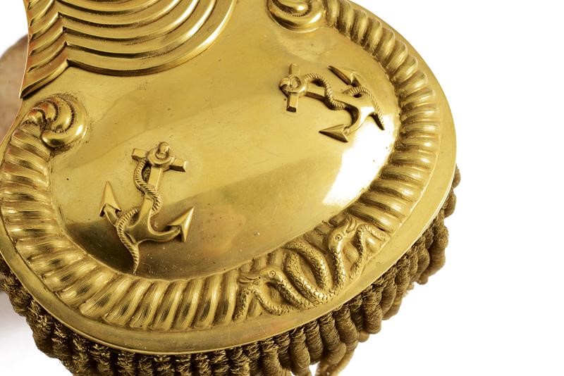 Plate in two pieces, made of hand-embossed and gilded metal provided with two anchors and gilded fringes (good conditions). Damaged lining, easily repairable. In a box of a well-know manufacturer from Milan.