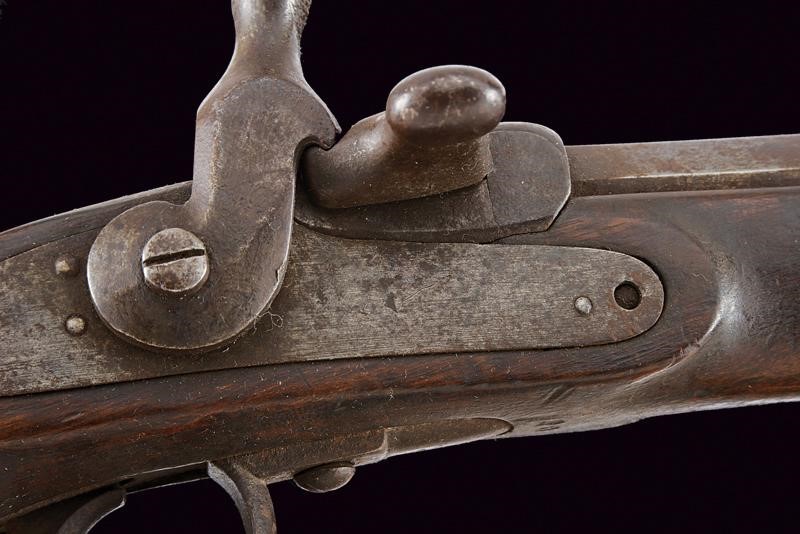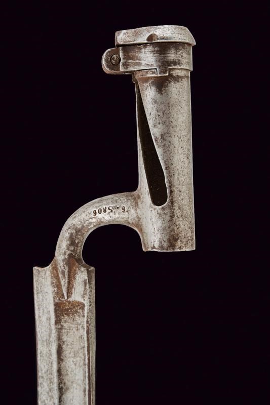 Rifled, octagonal, 15.2 mm cal. barrel (bore with pitting, partially visible rifling). Cylindrical nozzle with foresight and clutch for the bayonet. Folding bolt on the left side, with integrated ring firing pin. The cock with stud keeping the bolt in position at the moment of firing. Unmarked lock, one screw is stripped. Working mechanism. Long wooden stock with iron mounts. With socket bayonet (length 70.5 cm). Various signs of use and time. Probably a rare experimental piece.