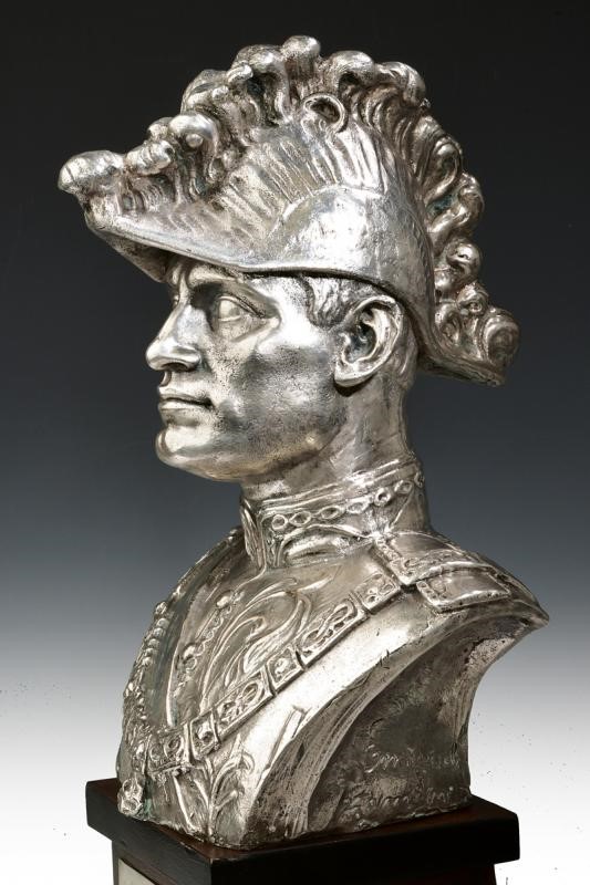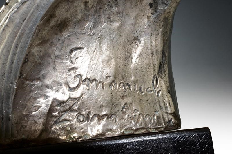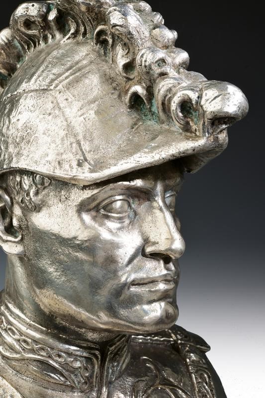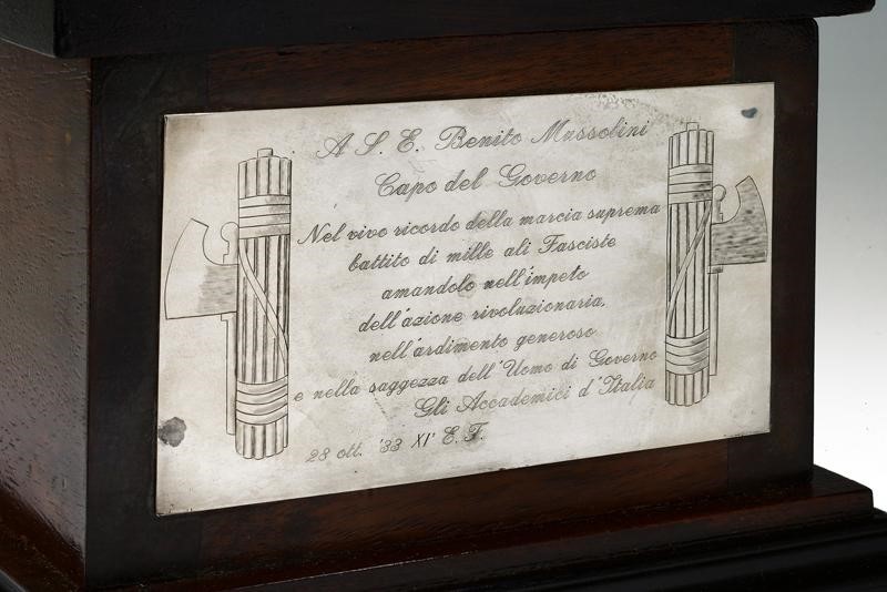 A beautiful in the round sculpture depicting Mussolini in uniform with bicorn and the collar of an order (SS. Annunziata?) around his chest. Important silver casting (not marked). Placed on a wooden pedestal with a metal plate featuring the inscription "A.S.E. Benito Mussolini Head of Government, in vivid memory of the supreme march fluttering a thousand Fascist wings, loving him in the force of his revolutionary action, in his generous bravery and in the wisdom of the Man of Government. The Academics of Italy October 28th '33 XI E.F." Signed on the lower left.