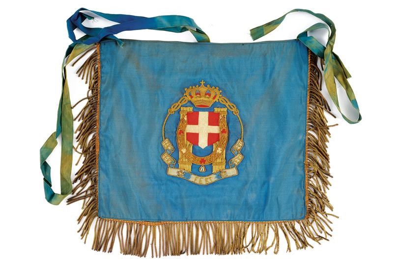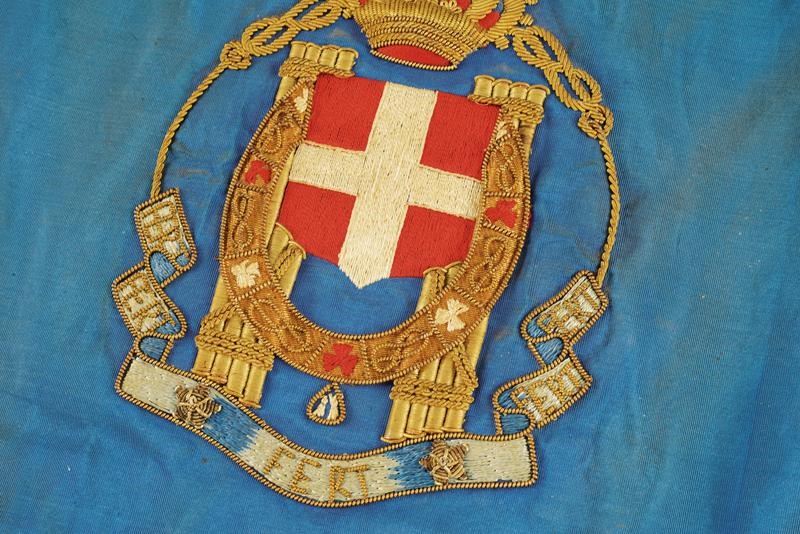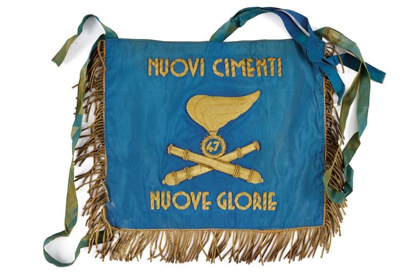 One side with a big artillery badge mark and the unit's motto (47th regiment of the Field Artillery) "NUOVI CIMENTI - NUOVE GLORIE" finely embroidered on a blue background. The opposite side featuring the State coat of arms on a blue background. Gilded-thread fringes on three sides.