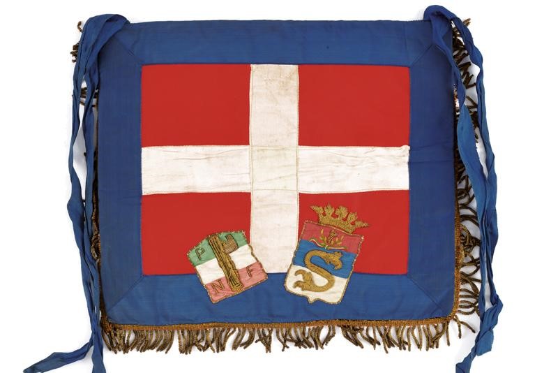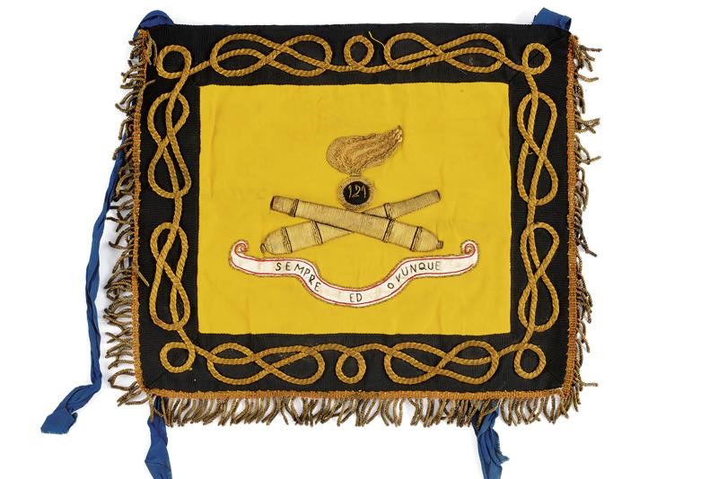 One side with a large coat of arms of the 121st artillery regiment over the motto "SEMPRE ED OVUNQUE" on a yellow background, surrounded by a black frame with Savoy knots. The other side with Savoy cross, the PNF coat of arms and the coat of arms of a city under crown. In a blue frame. Gilded-thread fringes on three sides.