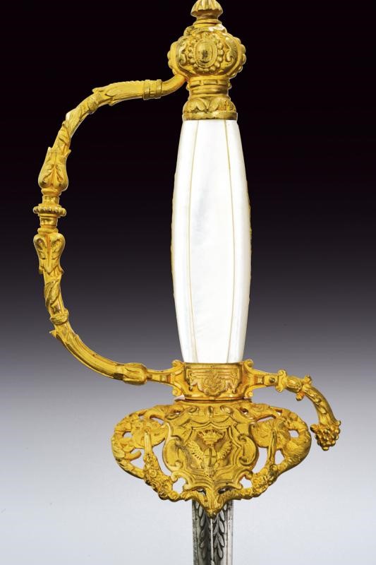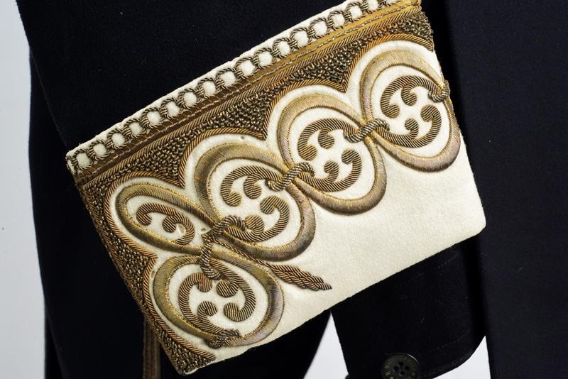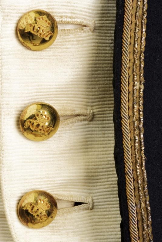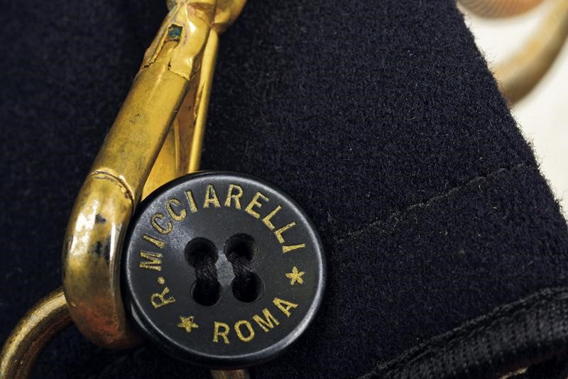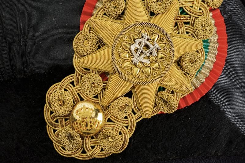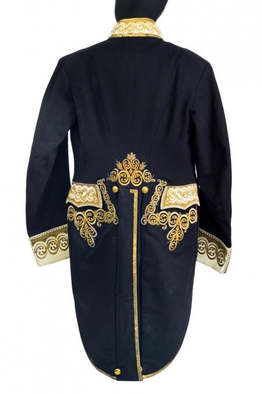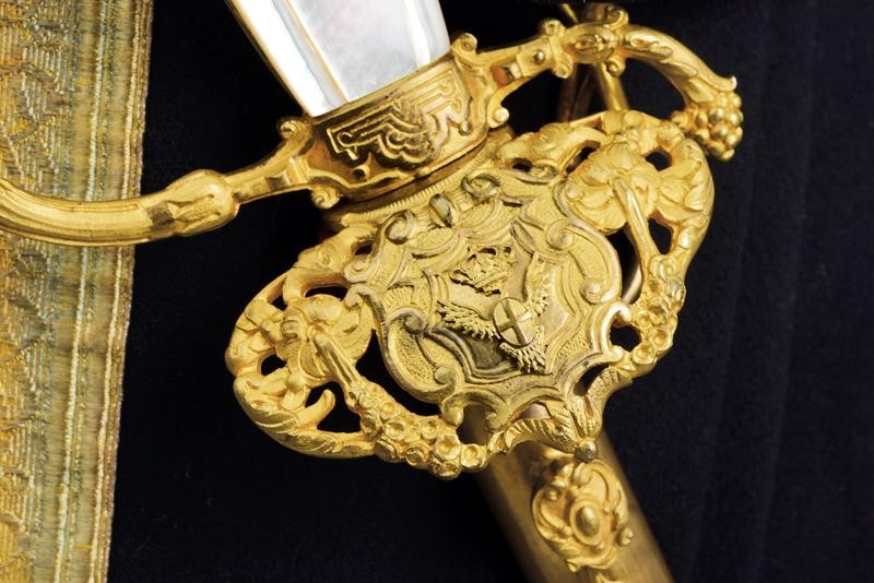 Black felt bicorn with moirÈ silk border, provided with a beautiful loop featuring the monogram "VE" and button with motto "FERT", complete with black ostrich feathers (in a damaged case). Black fabric waistcoat with white collar, cuffs and back pockets, finely decorated with gilded-threads, the edges at the back decorated en suite but on a black background, the edge with sequins. Golden buttons with the motto "FERT" under crown. Buttonholes on the front side. Complete with white waistcoat (with buttons en suite) and trousers with gold braid decorated with Savoy knots. Together with a small sword featuring a triangular-section blade, with engravings and gilded-brass hilt; shell-guard with Savoy eagle. Complete with scabbard and clutches.