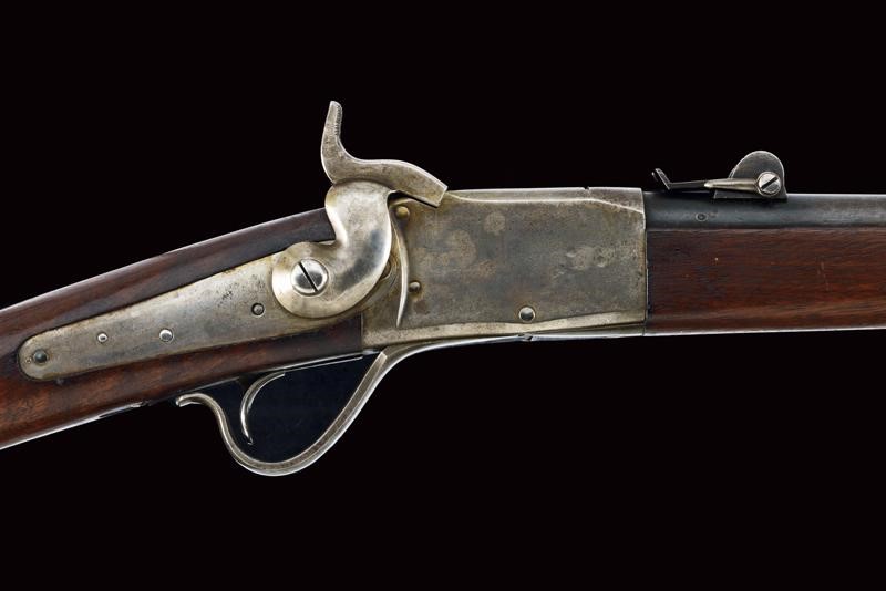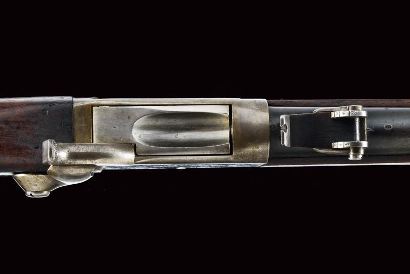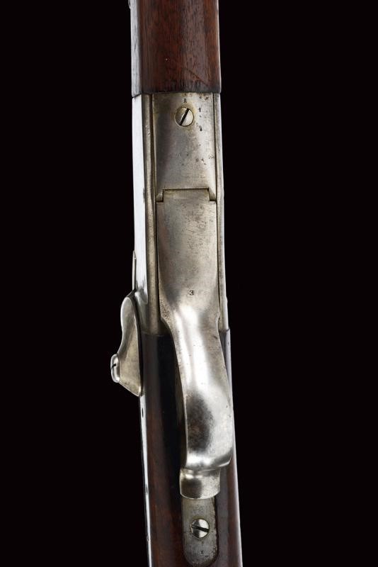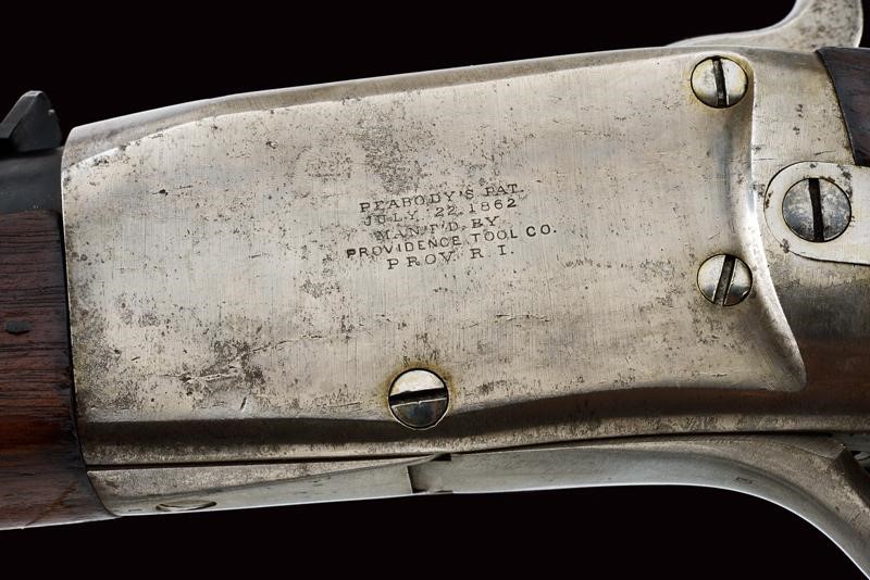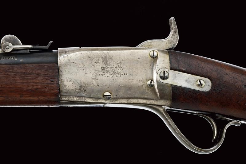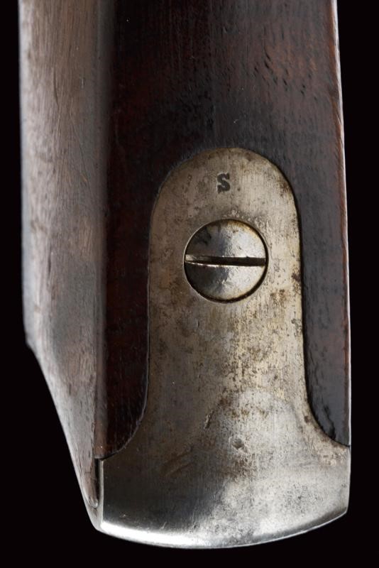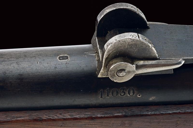 Rifled barrel of round section, marked "V" and "M" under Helvetic cross, "U" and serial number "110xx", provided with adjustable rear sight and front sight, 10.4 mm cal at the nozzle, with browning. Clean bore, visible rifling. Frame with Peabody patent and address of the Providence Tool Co. Bolt with falling block. Working mechanism. Backward spring lock. Smooth, wooden butt and fore-end. Iron mounts and ramrod.
