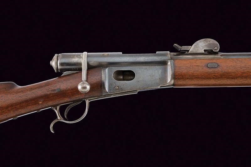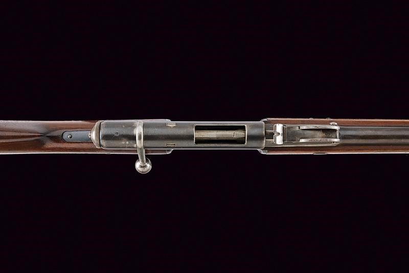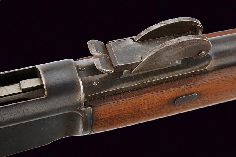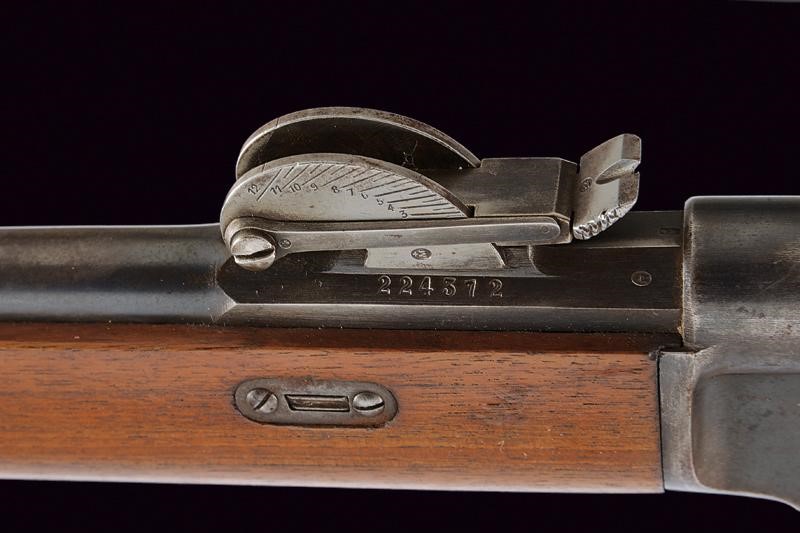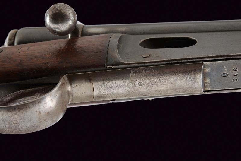 Round, rifled, barrel (visible rifling, clean bore), provided with front sight, adjustable rear sight, with octagonal breech marked "R", "V" and "M" all surmounted by a Helvetic cross, 10.4 mm cal at the nozzle. Sliding-revolving bolt. Rim-fire. Frame marked "WAFFENFABRIK BERN" matr. "224xxx" and with the model "M. 81". Smooth wooden stock and fore-end. Iron mounts and ramrod. Remains of antique browning. Trigger guard with finger rest.