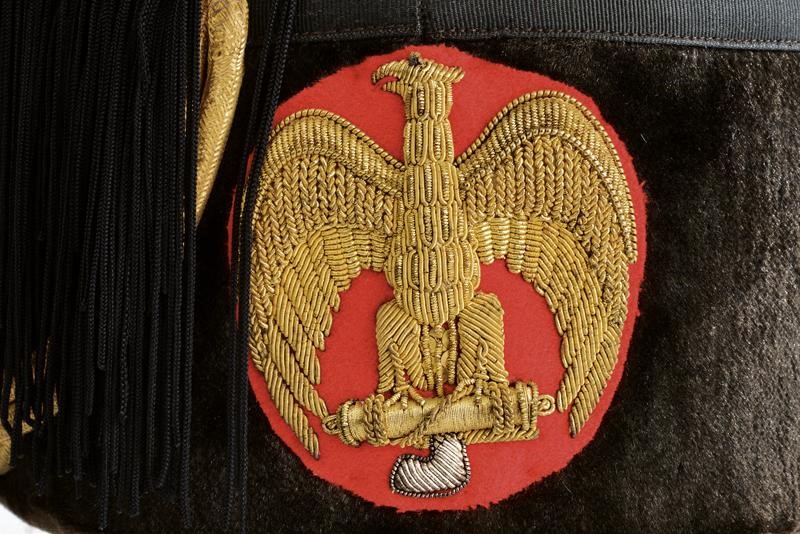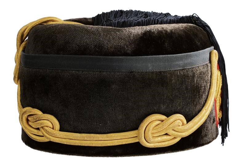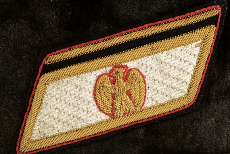Made of black beaver skin. Front decoration with gilded-thread embroidery depicting a relieved eagle on fasces and on red background. Complete with rope and fringes, the side chevron with eagle and purl borders. Dark-brown sweat band inside and white silk cap marked "Fez Colbak Extrafino Brevettato" below an eagle. Small signs of use. Very rare.
