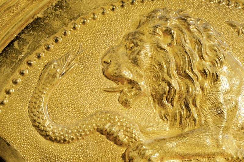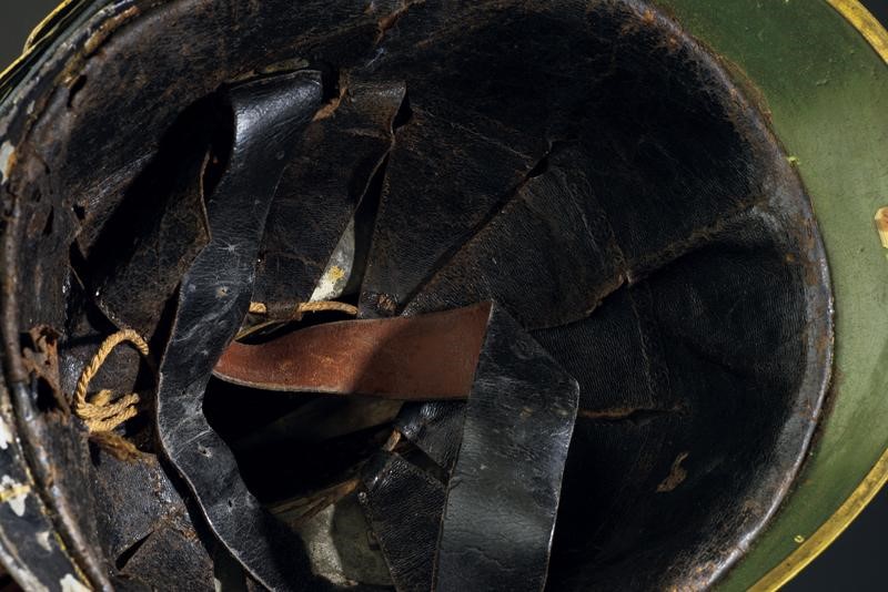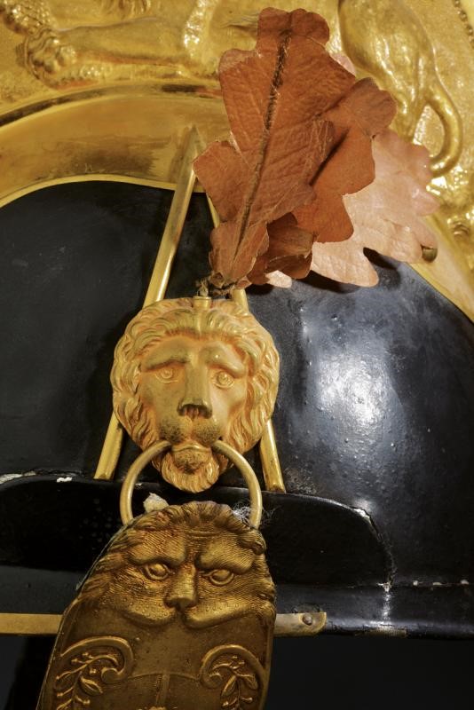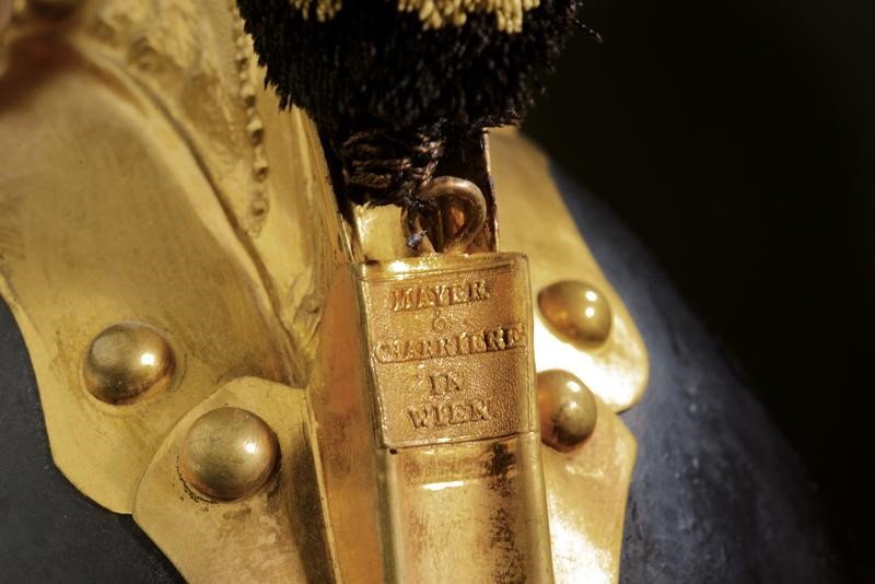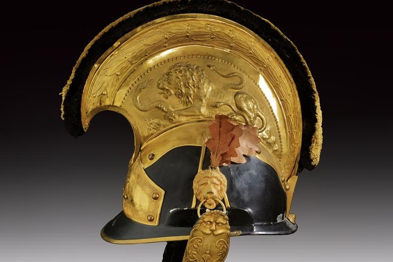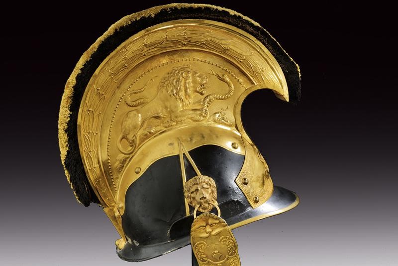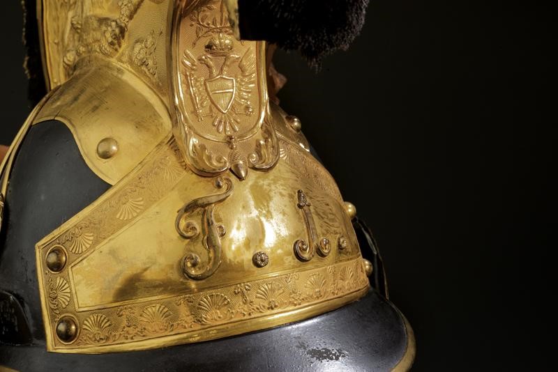 Black-lacquered iron skull with gilded brass mounts, big badge with monogram "F 1" at the front, imperial eagle above, high crest embossed with a lion and a snake, laurel leaves on the border, complete with the very rare, original, yellow and black chenille crest. Wide chin-strap armoured with gilded brass plates and decorated with floral motifs in bas-relief, the last pate featuring a lion's head. Leather sweat-band. Black lacquered iron cuirass complete with a rare leather strap (cuirasses of this kind were worn without breast-plate) and with gilded mounts. Small damages, black lacquer refreshed.
