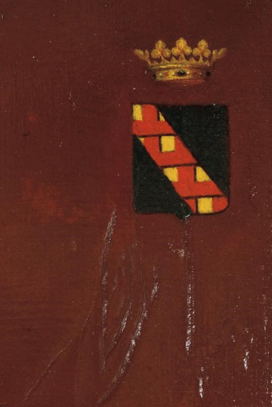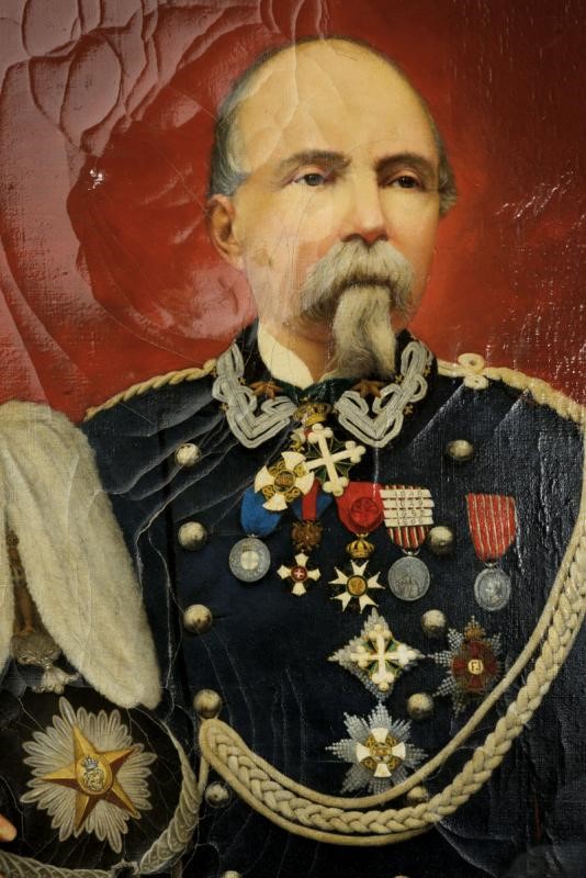 Beautiful oil on canvas depicting a general of the Umbertine period in full dress with helmet under his arm. The breast-plate with various coat of arms including the Crown of Italy, Saints Maurice and Lazarus, Order of Franz Joseph and medals including the Napoleon III's medal for the Campaign of Italy and the Wars of Independence. On a dark red background. A heraldic emblem on the top right side. Craquelure. Unsigned. In s large gilded and stuccoed wooden frame.