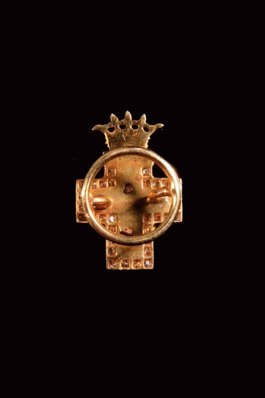 A miniature of the White Cross made of gold, rose-cut diamonds and enamels. With button at the back.