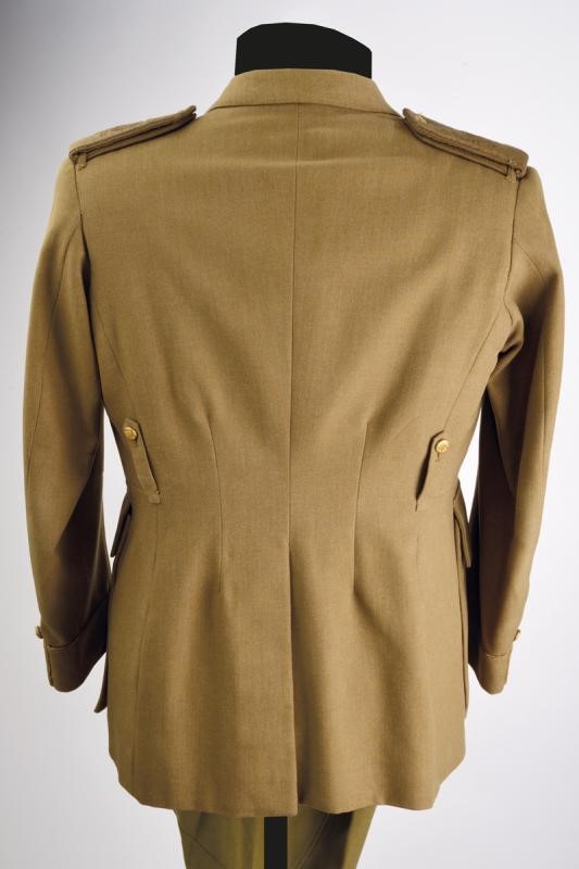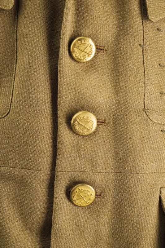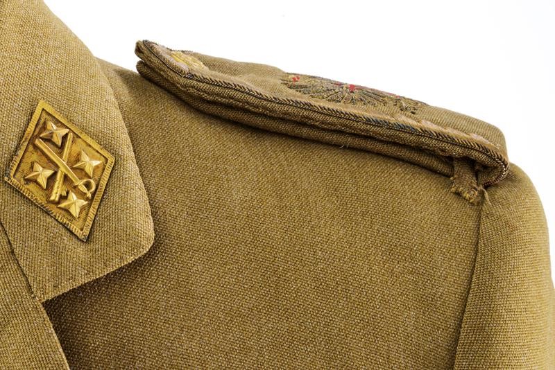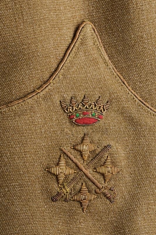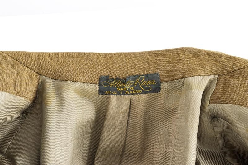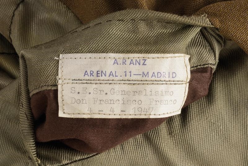 A uniform of a Captain General of the army that belonged to the Caudillo of Spain, consisting of jacket and trousers. Both made of grey-green fabric, the jacket complete with epaulettes, badges of rank, with several buttonholes for ranks at the front, buttons with crossed stick and sabre under crown. Green silk lining, the collar with label "Alberto Ranz SASTRE ARENAL 11 MADRID". Label with name and address of the tailor and "H. E. Sr. Generalissimo Don Francisco Franco 4 - 4 - 1947" inside the pocket. The trousers with label of the same tailor and "S. E. Sr. Generalissimo Don Francisco Franco".