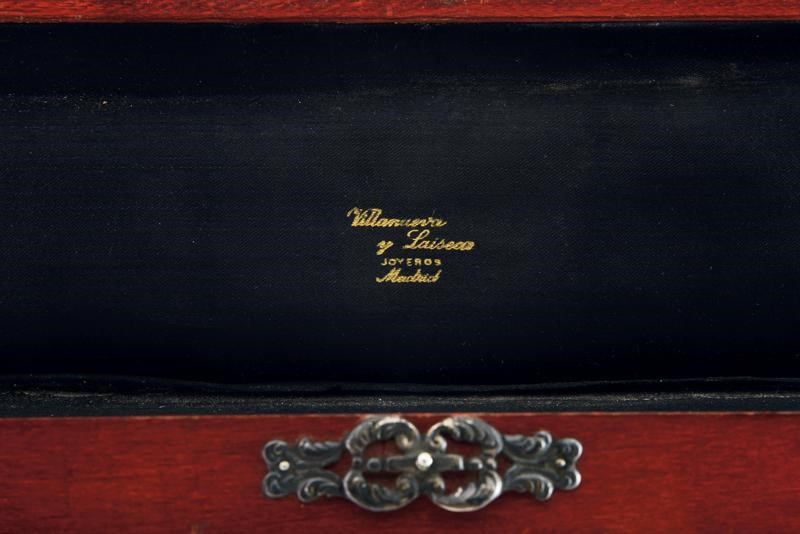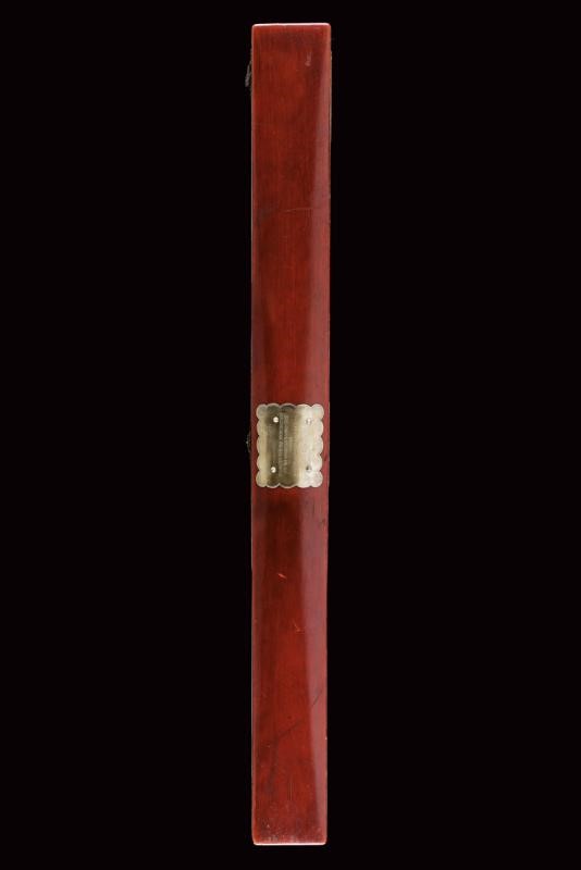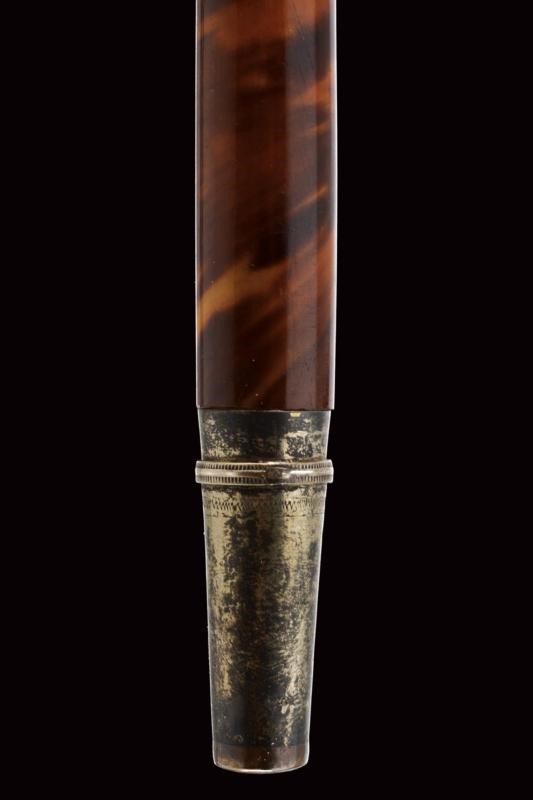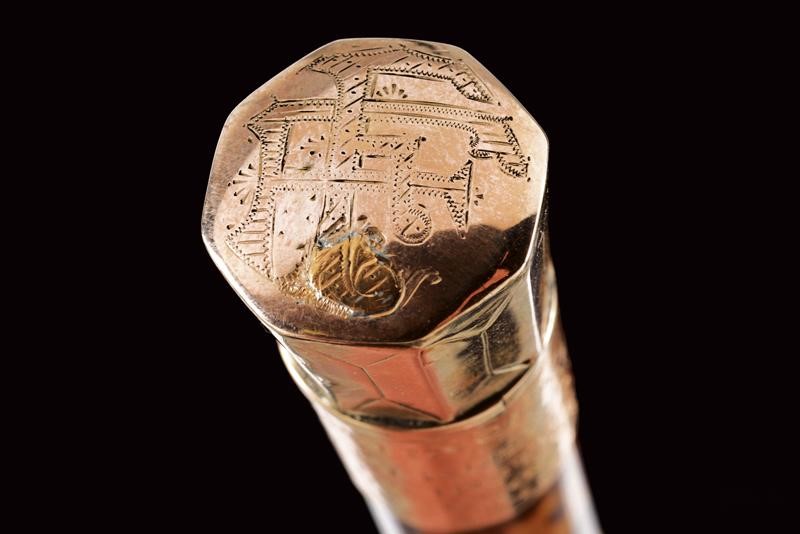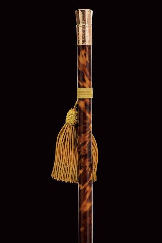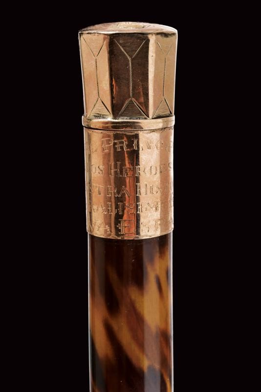 Commander stick belonged to the Caudillo, gifted on the occasion of the 20th anniversary of the Legion's foundation by the Legion's member themselves. Yellow gold handle with inscription "AL PRINCIPE LOS HEROES DE NUESTRA HISTORIA GENERALISSIMO FRANCO VIVA ESPANA" on the lower band, the pommel (small restoration) with monogram "FF" for Francisco Franco. Cylindrical wooden shaft slightly tapered towards the shoe, covered with tortoiseshell, silver-plated metal shoe. Two tassels with gold-thread fringes on the upper part. Kept in its wooden presentation scabbard; a silver label on the lid with the dedication: "A S. E FRANCISCO FRANCO GENERALISSIMO Y JEFE DEL ESTADO ESPANOL EN EL XX ANNIVERSARIO DE LA FUNDACION DE LA LEGION 1920 1940'. Black silk lining. One of the three silver closures is incomplete.