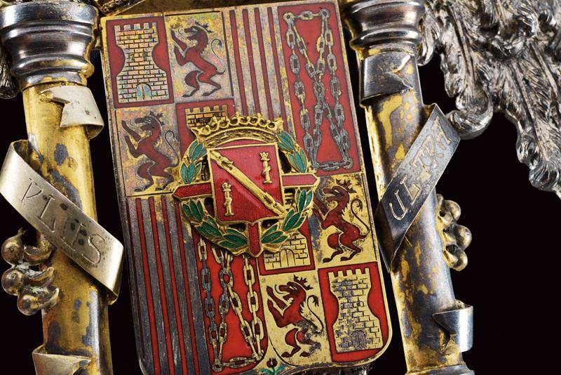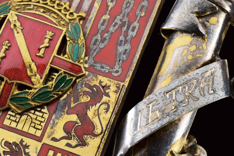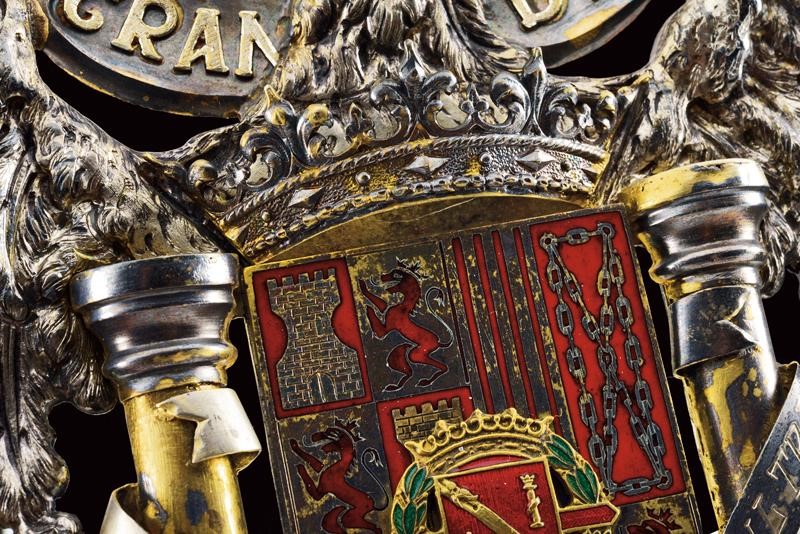 A large ornament probably applied on a book or another present for the Caudillo, depicting a big eagle with the coat of arms of Spain at the center featuring the Caudillo's coat of arms; both engraved and enamelled. On the sides two columns held by the eagle's claws marked 'PLUS' and 'ULTRA' (the motto of Spain), a bandeau 'UNA GRANDE LIBRE' above the wings. A ring and four mounting screws.