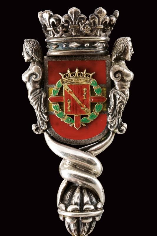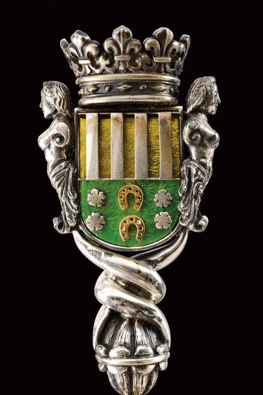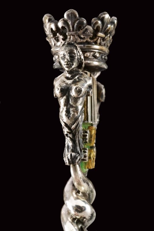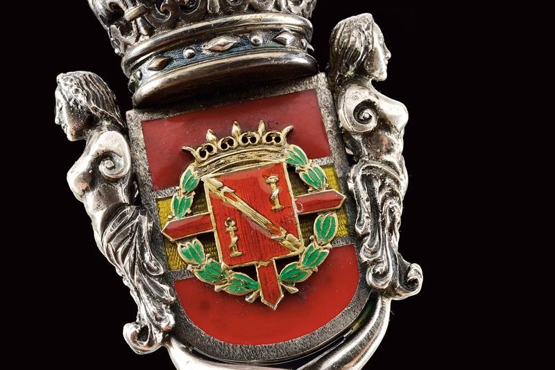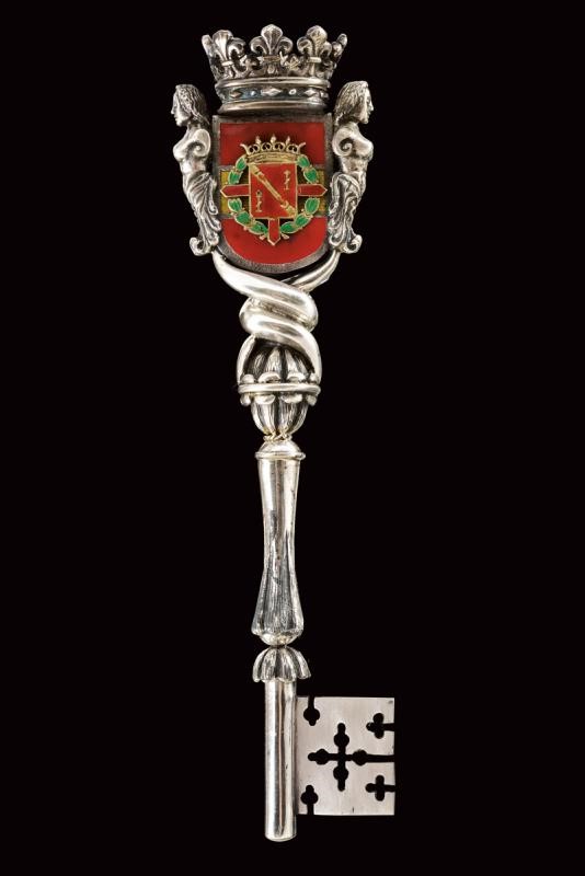 Beautiful key donated to Francisco Franco y Bahamonde by the Community of San Vincente del Raspeig, made of silver. One side of the handle decorated with Caudillo coat of arms, the other with the city coat of arms, made of enameled silver, and the one of the city, the two badges with two female protomes on the sides and with a big crown surmounting the whole element. Finely decorated stem, with pierced bit. A typical gift that the various cities offered to the Francisco Franco, Caudillo of Spain.