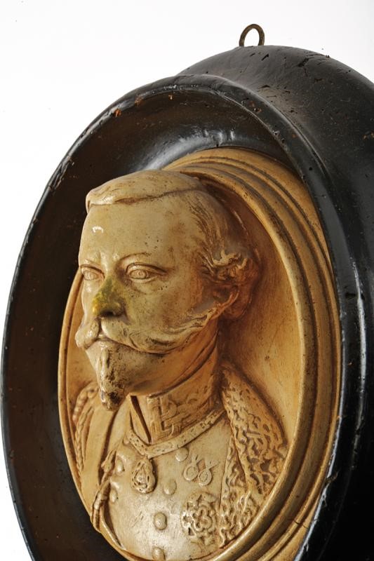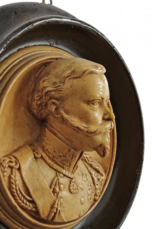 Ceramic bust depicting the king in high relief (almost in the round) wearing his uniform with orders. In a contemporary black-lacquered wooden frame, moth holes.