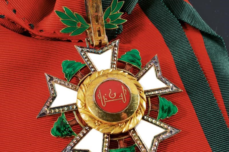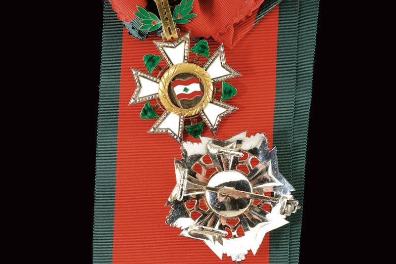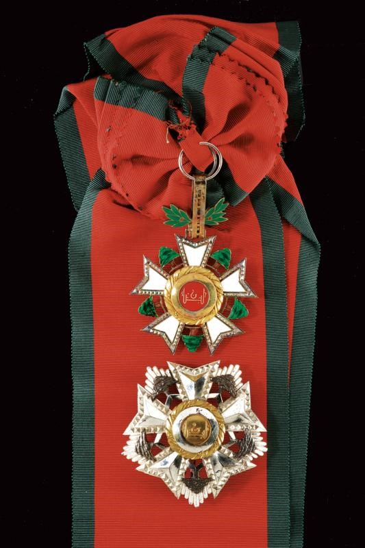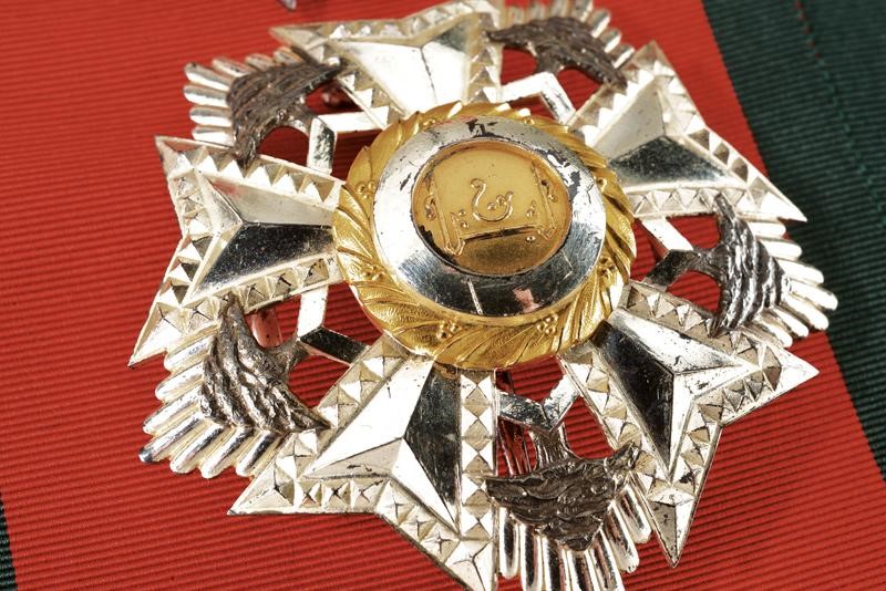 Grand Cross set made of partially gilded and enameled silver. Plaque marked "800" and with a mark. Pendant with sash.
