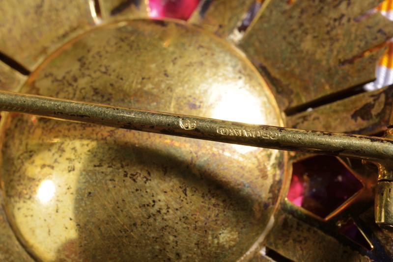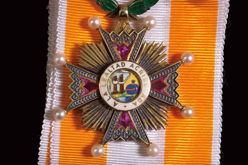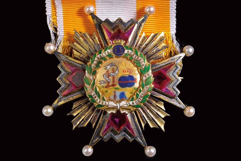 Grand Cross set for a lady. Both made of gilded metal, the arms decorated with semi-precious stones (Tourmaline) the tips with small pearls. The pendant with laurel wreath and ribbon. The plaque with vertical brooch and hook. Rare.