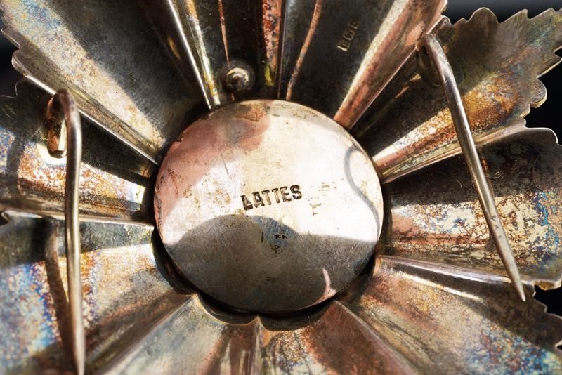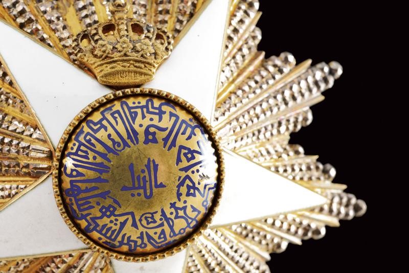 Order's plate made of partially enameled and gilded silver, marked 'LATTES', with vertical pin and two hooks. Kingdom of Egypt.