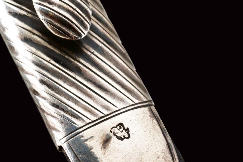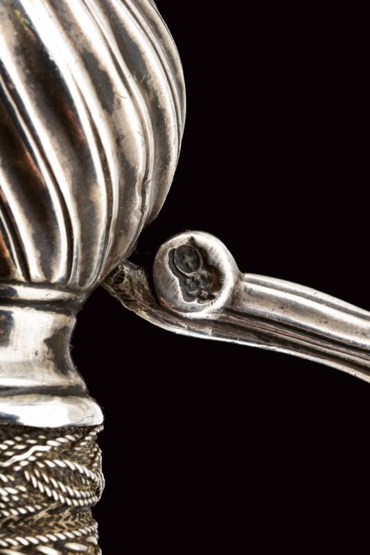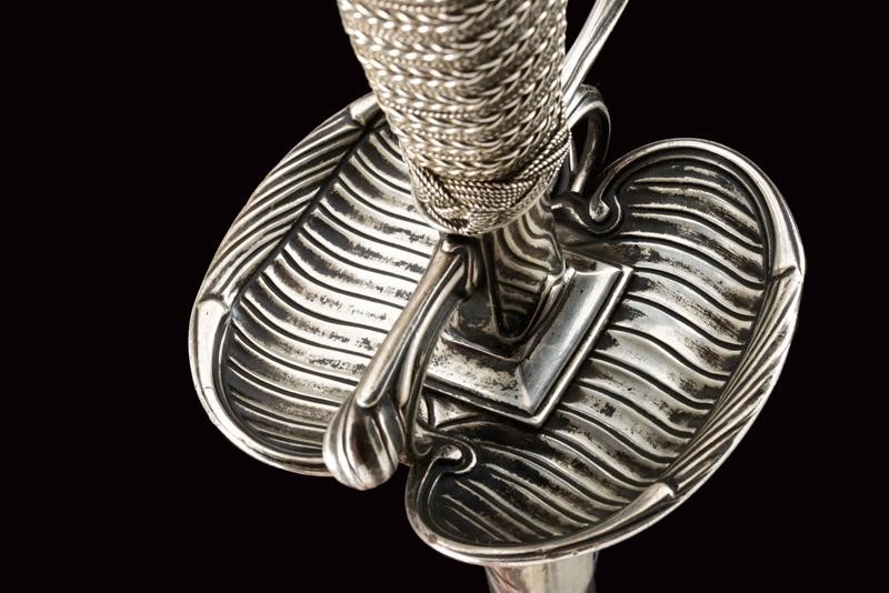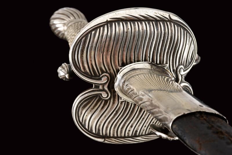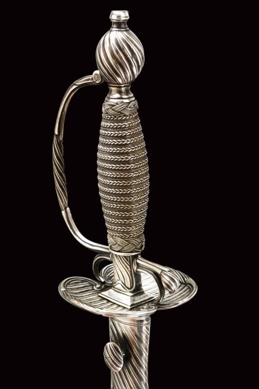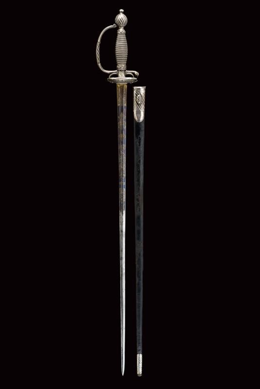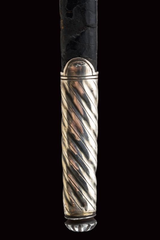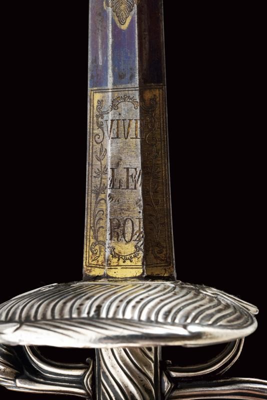 Straight blade of hexagonal section, the first part finely engraved and gilded on a blue background, and partially carved, with motto "VIVE LE ROI", Savoy eagle under crown and floral motifs. Solid, silver hilt with various Piedmontese marks, decorated with coils, the wooden grip covered with wire binding and silver wire Moor's heads. Leather scabbard (the surface with missing parts) with silver mounts decorated en suite, the cap with mark. Suspension button.