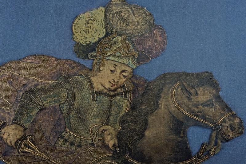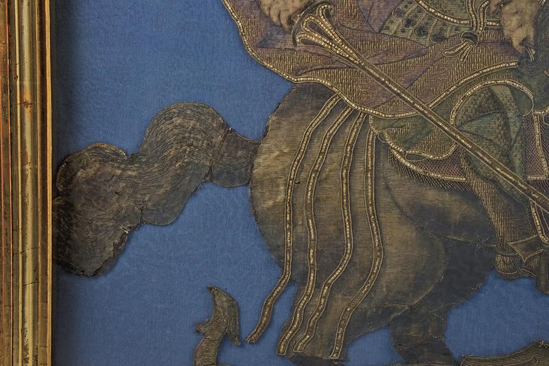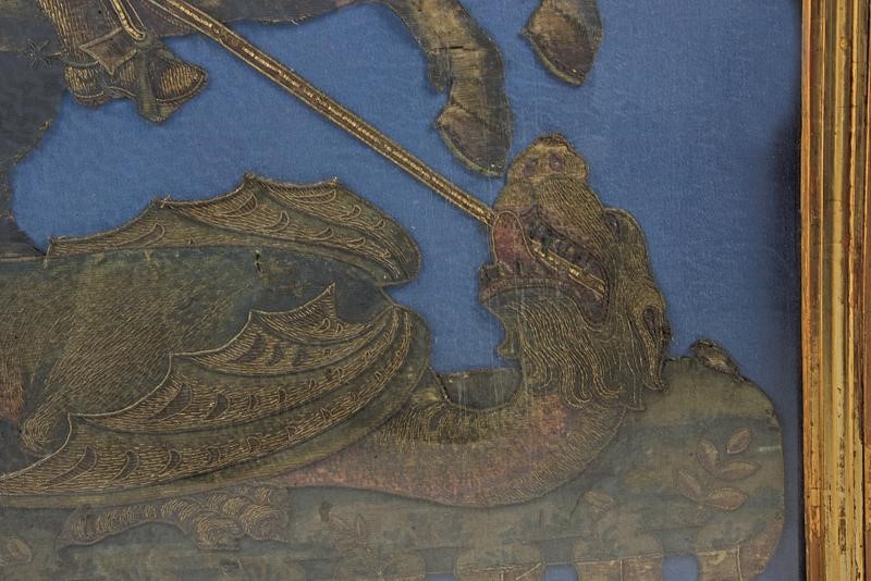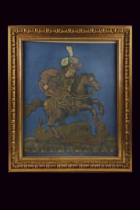 Polychrome embroidery on silk decorated with elements and thin gold metal bands depicting the heroic moment when St. George pierces the Dragon's head with his lance (a beautiful depiction of the lance, similar to those used in 15th and 16th century jousts). The figure is applied on a light-blue fabric background, under glass and within a beautiful, heavy stuccoed and gilded wooden frame (later).