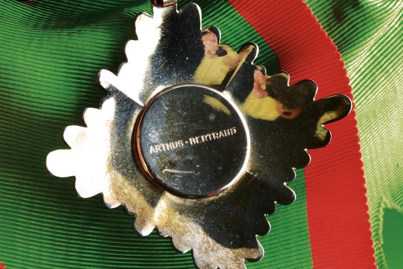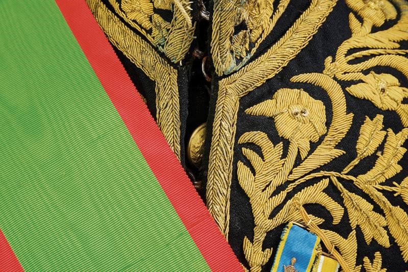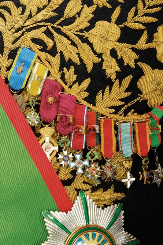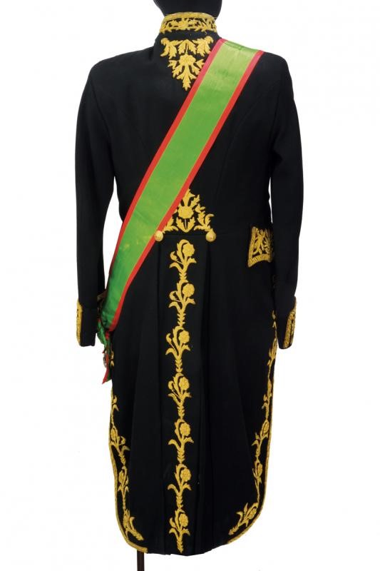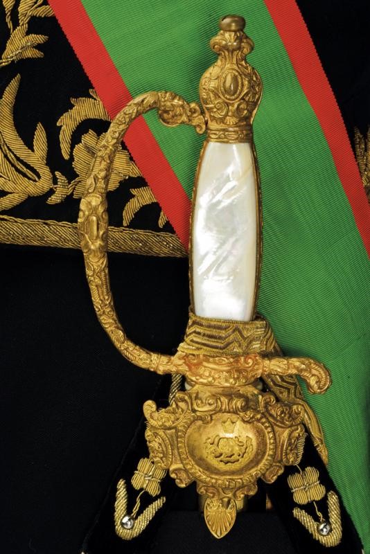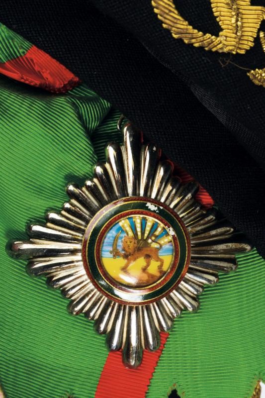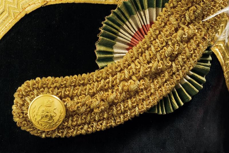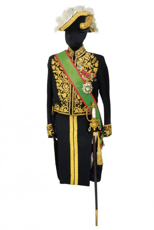 Black velvet bicorn with gold-threaded effects, silk cockade, gold button with imperial coat of arms and white ostrich feathers. Lined. Black fabric tail coat richly decorated with gold-threaded stitching. Provided with the band with pendant and the plaque of the Order of the Lion and the Sun (First Class Knight); the left side of the jacket provided with chain with miniatures: Commemorative Medal of the Coronation of Mohammed Reza Pahlavi (1967), Medal of the Crown (Knight), of George I (Greece) (Commander), of the Crown (Belgium) (Official Knight), of Merit (Grand Duchy of Luxembourg) (Knight Grand Cross), National of Cedar (Lebanon) (Knight of the Grand Cross), of San Silvestro (Papal State) (Knight of the Grand Cross), to Merit (Italy) (Official Knight), of San Silvestro (Papal State) (Knight) and of the Lion and the Sun (Iran) (Knight of the Grand Cross). Together with black trousers with golden-threaded side bands. Provided with small sword featuring a blade engraved by the manufacturer Hörster in Solingen, brass hilt with imperial coat of arms on the butt-plate and handle with mother-of-pearl cheeks. Provided with sword-knot and scabbard. A rare set.