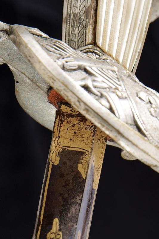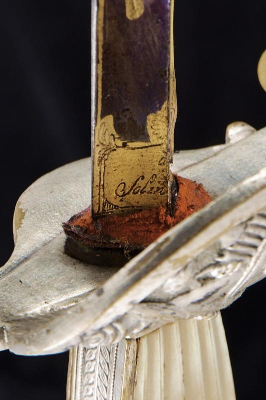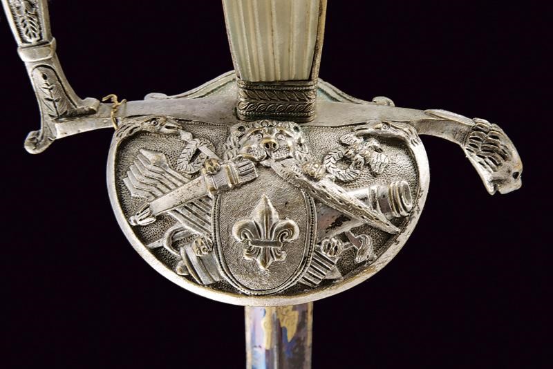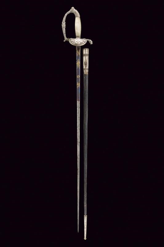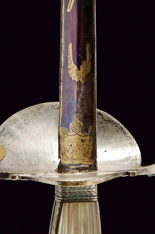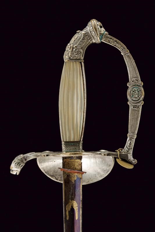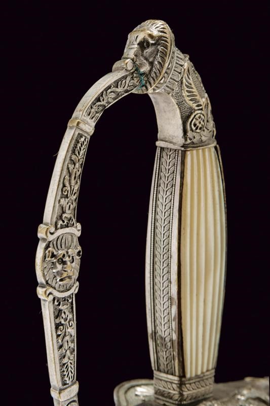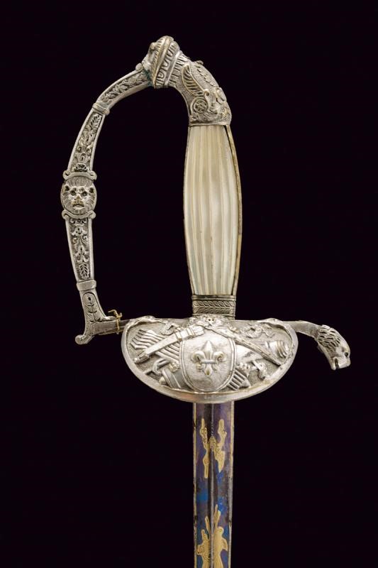 Straight blade of triangular section with hollow faces, engraved at the forte with small trophies and racemes, gilded and on a background with remains of blueing, at the base signature of a Solingen manufactory. Minor signs of use and time. Silver-plated brass hilt, featuring shell-guard decorated with a Bourbon lily in relief surmounted on a shield surmounted by a lion and with a trophy of arms. Guard shaped as a lion's head and floral motifs in relief, also the pommel shaped as a lion's head. Grip with mother-of-pearl grip scales. Earlier leather scabbard (some repaired parts) with brass mounts, engraved and silver-plated en suite. Cf. a very similar model in 'Storia dell'Arma Bianca Italiana' by Calamandrei (ed. Olimpia 1999), A p. 412 with photo. Probably for court dignitaries.