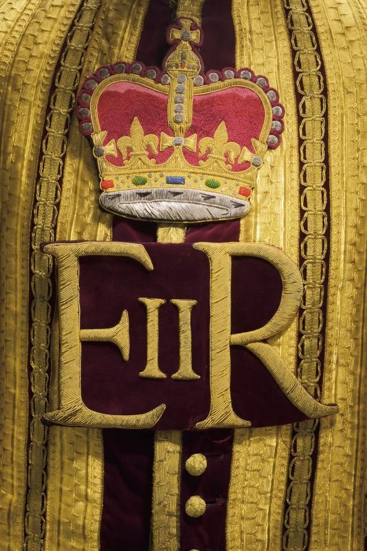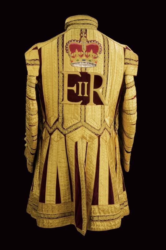 Made of burgundy velvet with black velvet collar and sleeves, almost completely covered with gold bands. With a big, gilded-thread monogram 'E II R' under crown, stitched in polychromy, on the front and back. Shoulders with small flaps. Interesting and rare uniform of a drum major in the service of Queen Elizabeth II; it is a clear evidence of the eternal glory of this famous royal dynasty.
