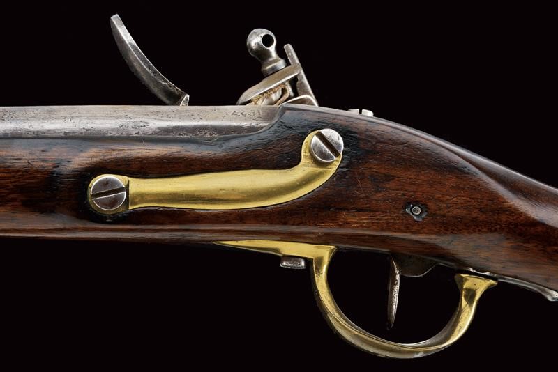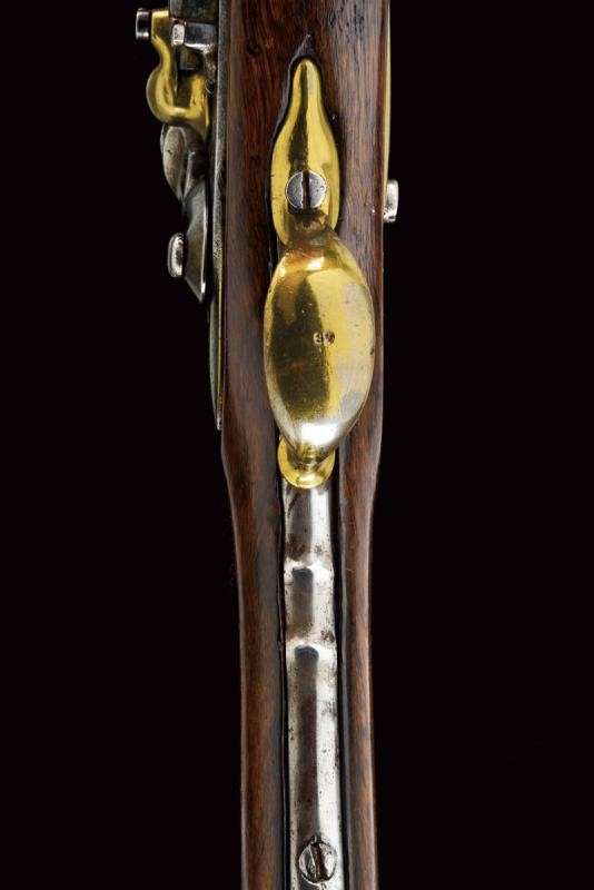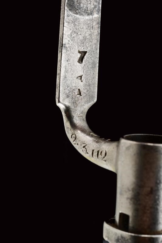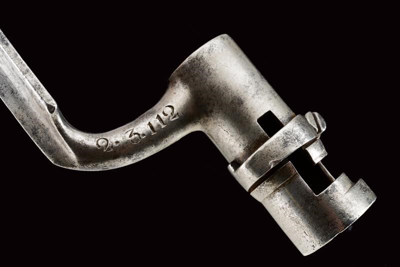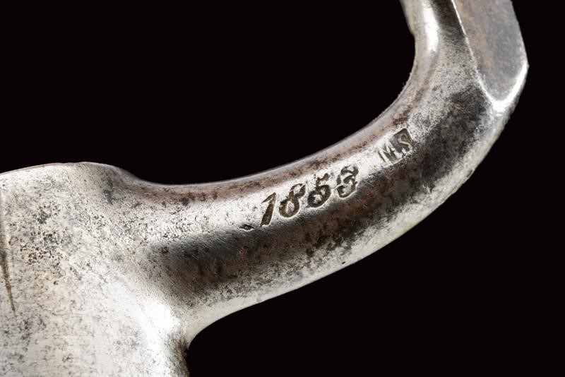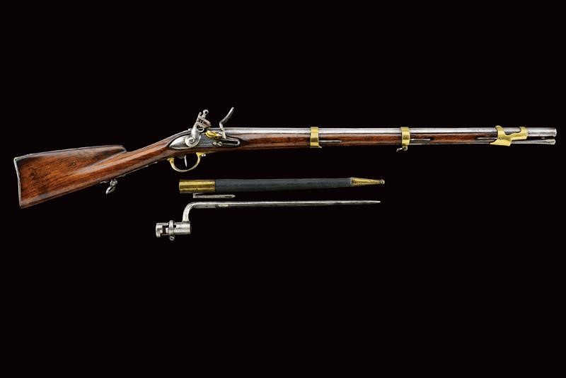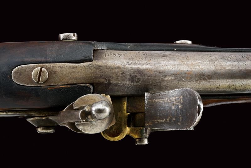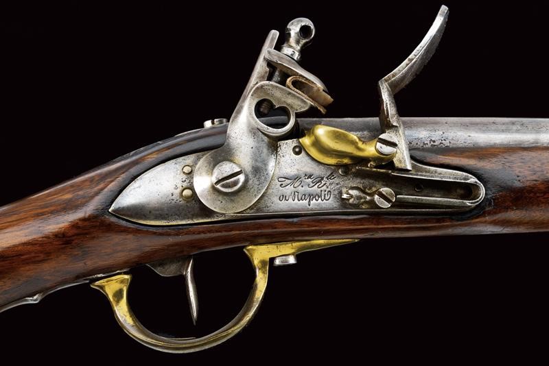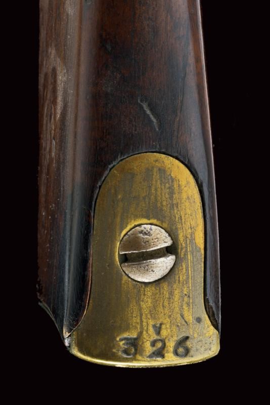 Round, smoothbore, 18 mm cal. barrel, dated "1827" (or 1837) at the base, clutch for the bayonet; flintlock marked "M.ra R.le di Napoli", brass pan. Wooden full stock with brass mounts and iron ramrod. Butt-plate marked 'V' and '326'. Socket bayonet marked "2. 3. 112", "1853" and "MS". Complete with leather scabbard with brass mounts and iron hook.