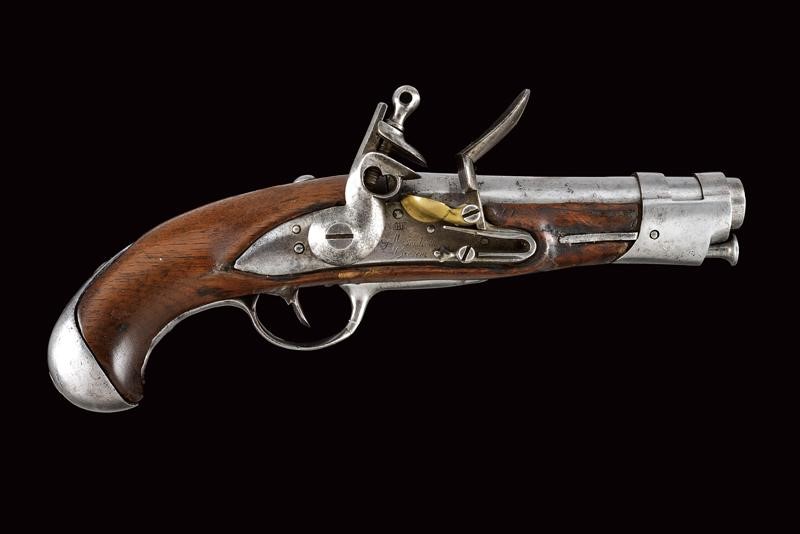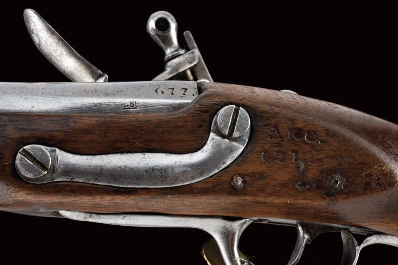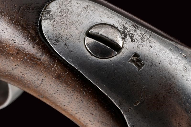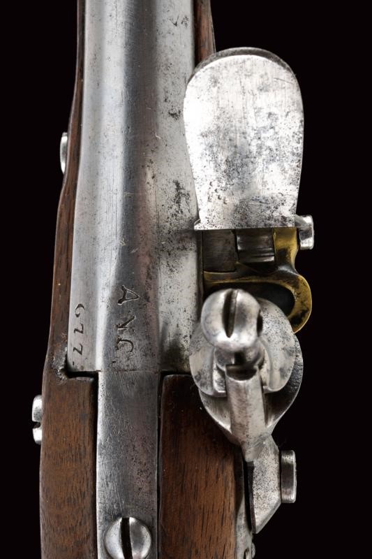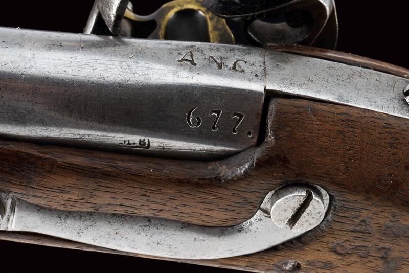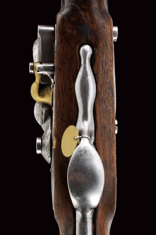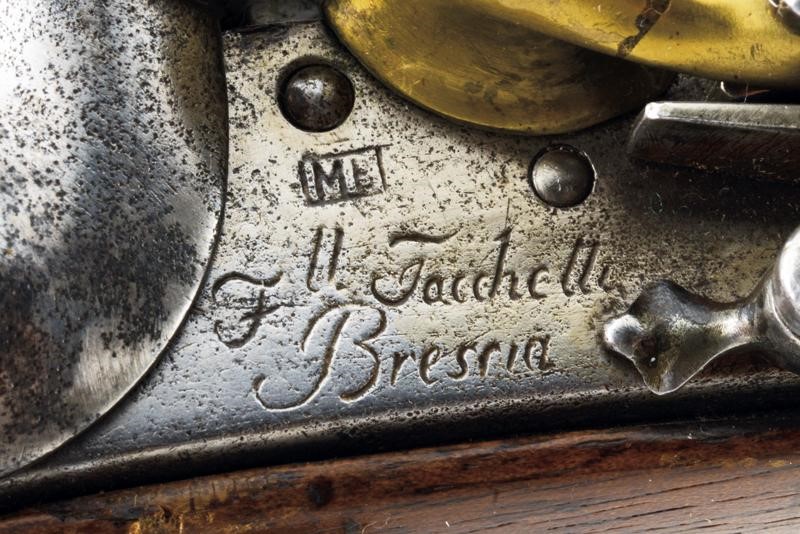Smoothbore, round, 15 mm cal. barrel, with octagonal breech. On the back marked "ANC" for the city of Ancona, remains of stamp and numbering. Lock marked "F.lli Jacchelli Brescia" and with mark. Working mechanism but tends to jam. Wooden full stock (old repairs in the front segment) stamped en suite with the barrel. Iron mounts and ramrod.