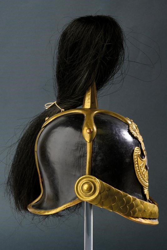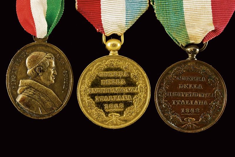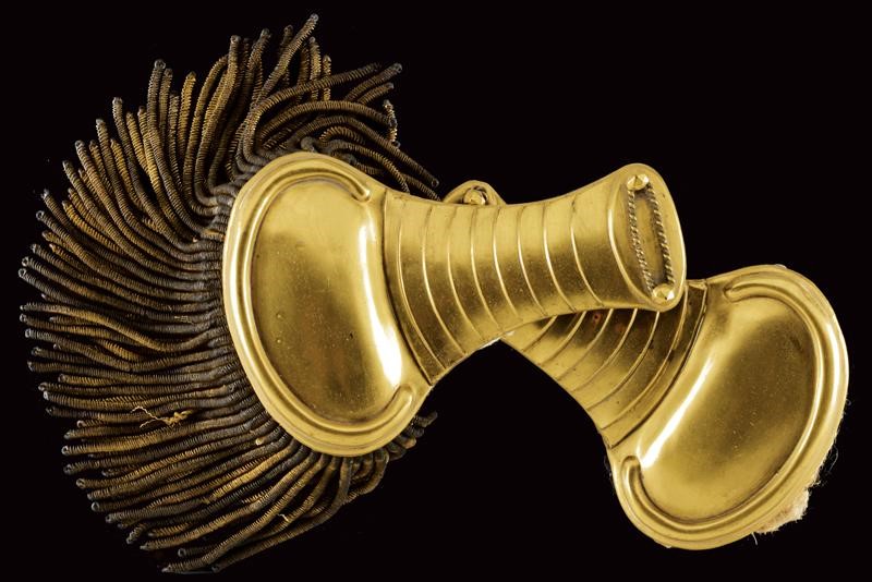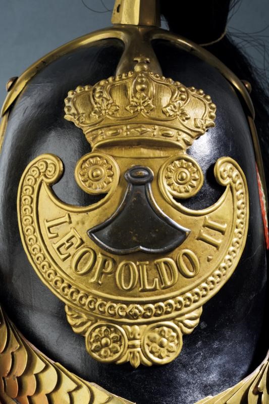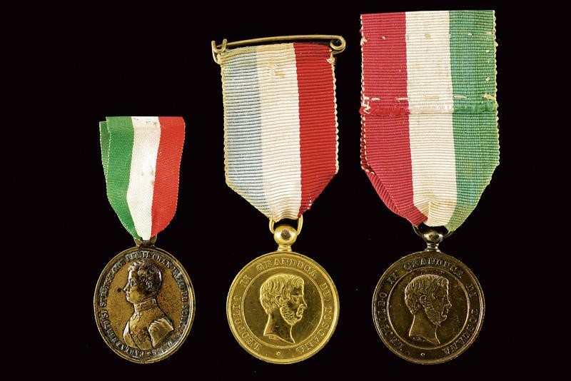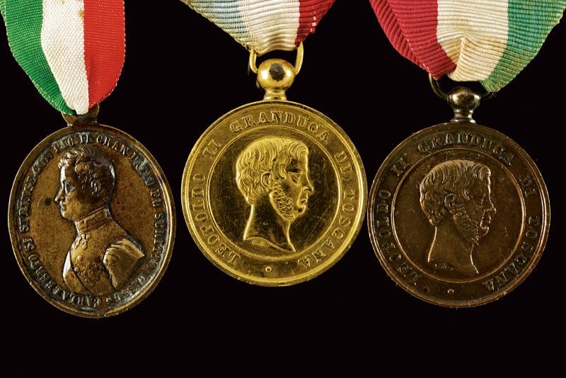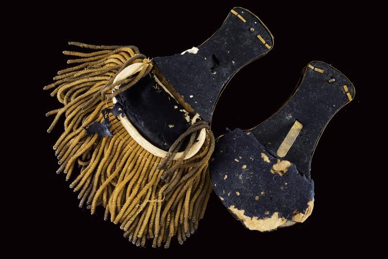 Boiled-leather helmet with brass mounts, front frieze with the inscription "Leopoldo II", tricolour metal cockade, complete with black horsehair, brown leather sweat-band inside. Epaulettes with gilded plates and fringes made of gilded threads. Including a gold medal "Guerra dell'Indipendenza Italiana 1848", another similar bronze medal, a medal with the effigy of Carlo Alberto and Pius IX, all with their tricolour ribbon. The Tuscan Civic Guard was established in 1847 by Grand Duke Leopold II on the model of the Roman one. During the First War of Independence, a battalion of the Civic Guard, together with volunteers and members of the regular army, took part in the well-known battle of Curtatone and Montanara against the Austrian army. The medals presented here refer to this episode.