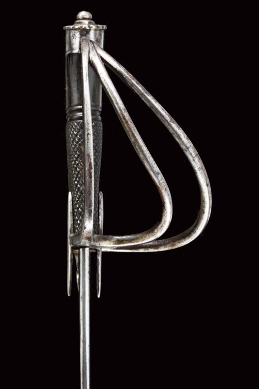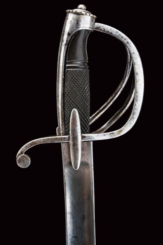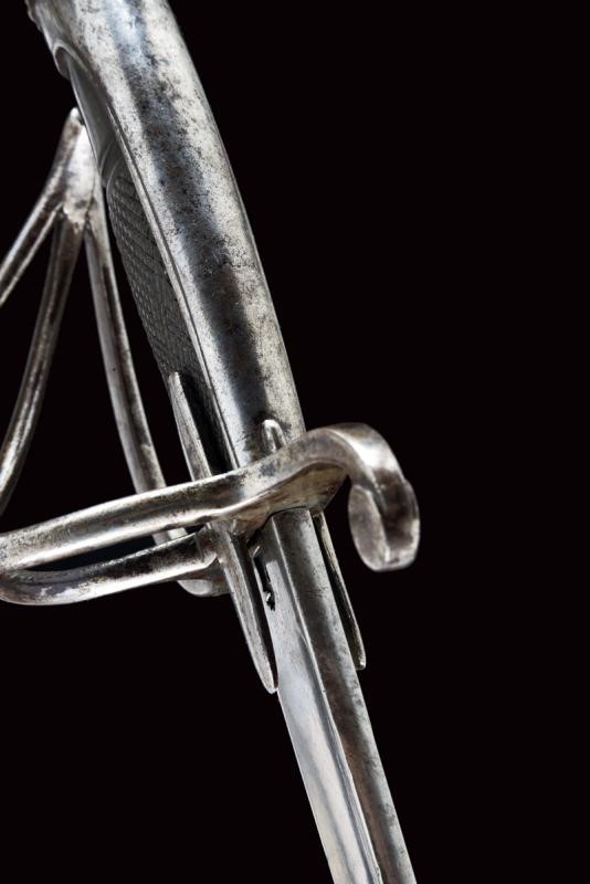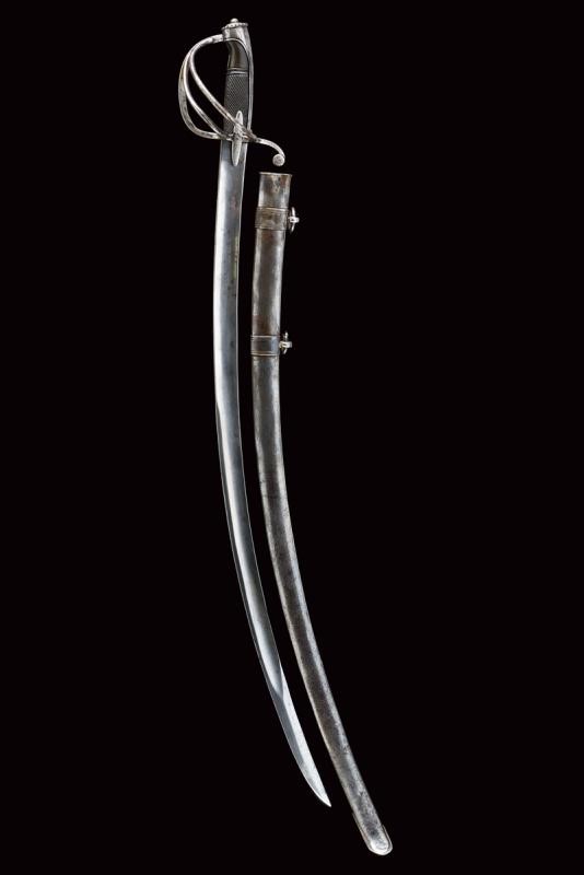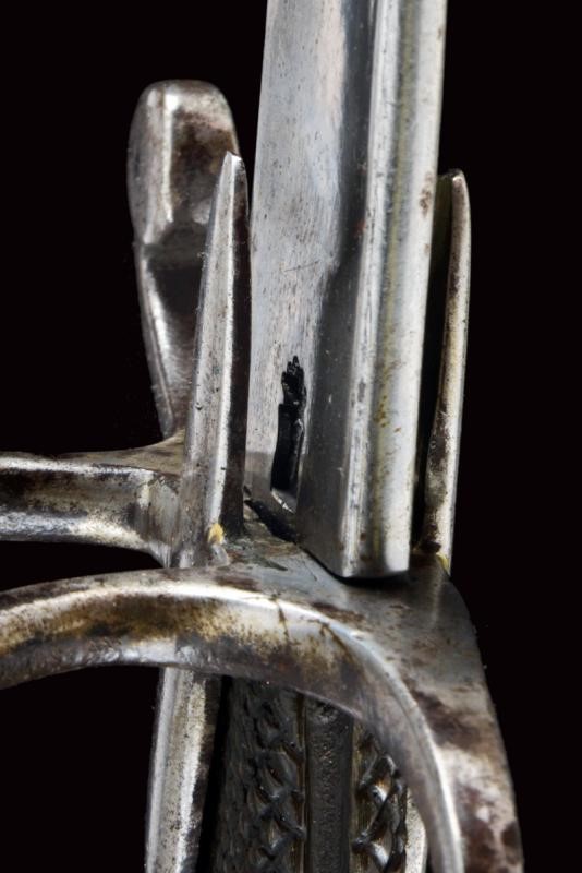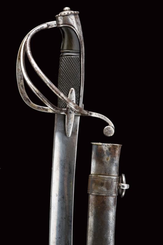 Curved, single-and short false-edged blade, with fuller for a good part of its length and provided with a tang. Hilt with a guard with two additional loop-guards and very elongated sheath-guard wings. Long cap ending with a back with festooned and buttoned edge. Dark horn grip partially checkered. Iron scabbard (small opening at the mouthpiece, repairs, signs of use and time) with two lugs. See "Armi Bianche Napoletane 1800 - 1860" by Tonelli / Conti (ed. Albertelli, Parma 2013), pp. 26-27.