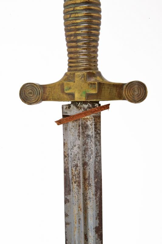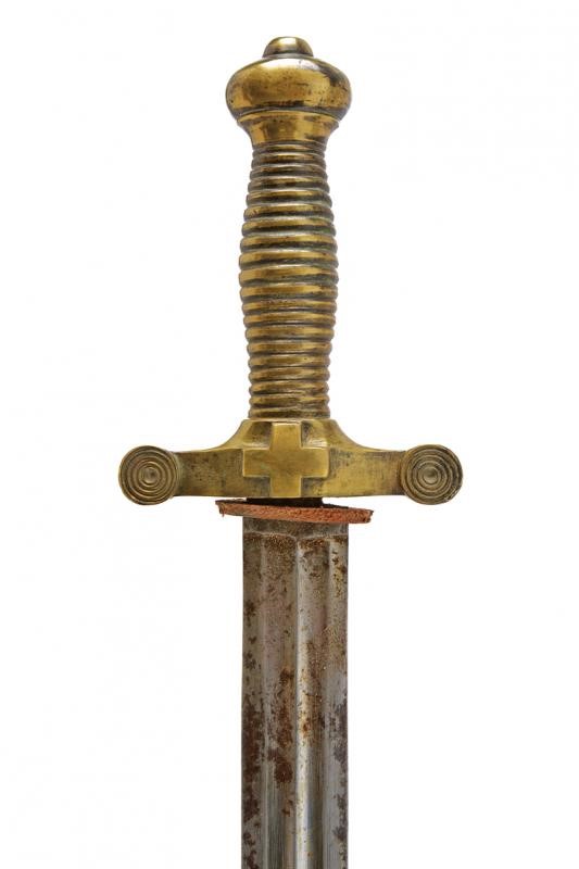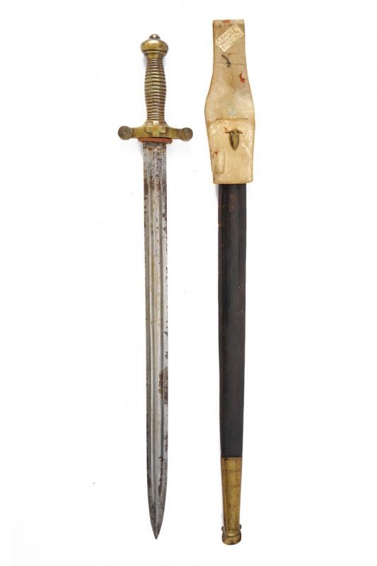 Straight, double-edged blade, with double fuller, pittings on the tip. Brass hilt, in one piece, with crossbar featuring a relieved cross at the centre. Leather scabbard sewn on the back (partial opening) with brass mounts. White, leather belt frog.