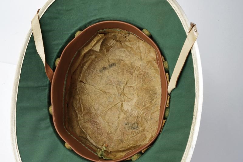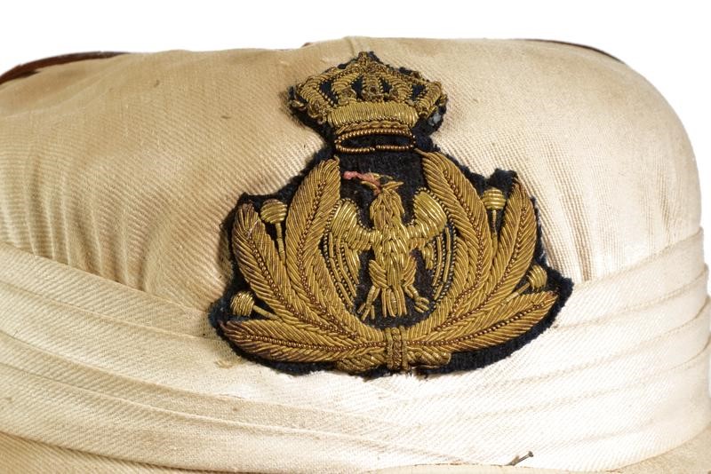Made of white cotton fabric, with band and straps, Navy frieze embroidered with gilded threads. Interior with brown leather sweat-band.