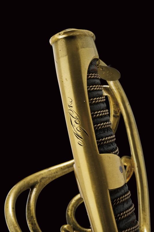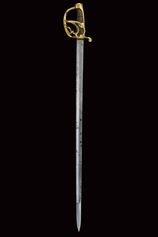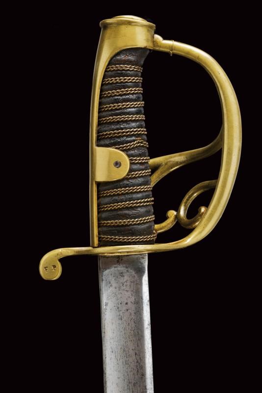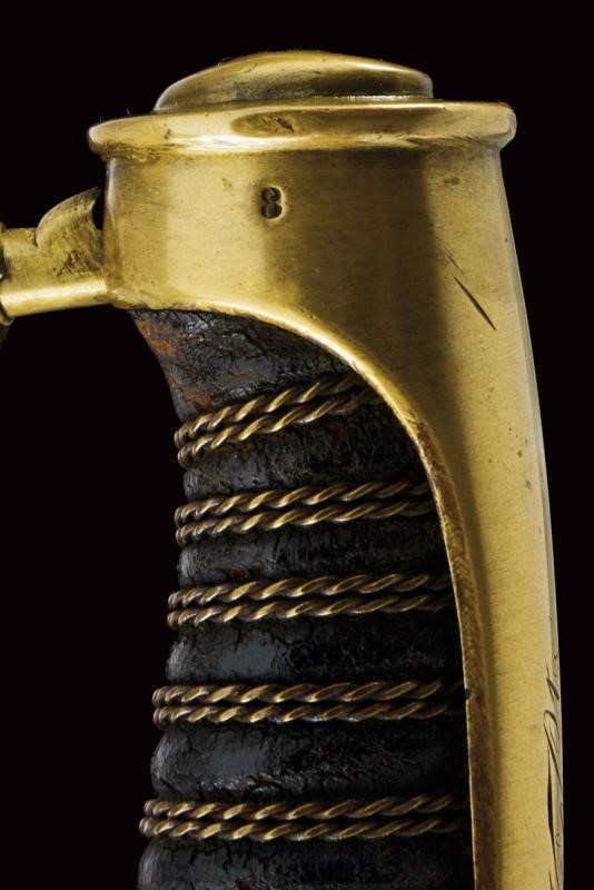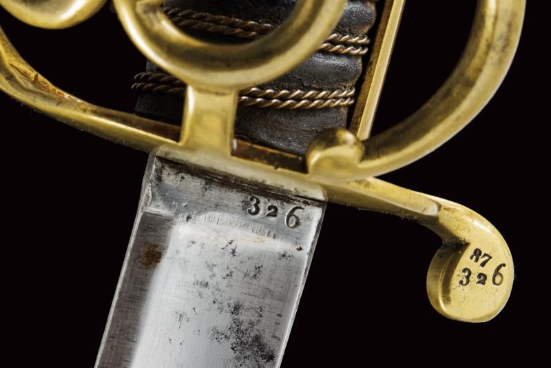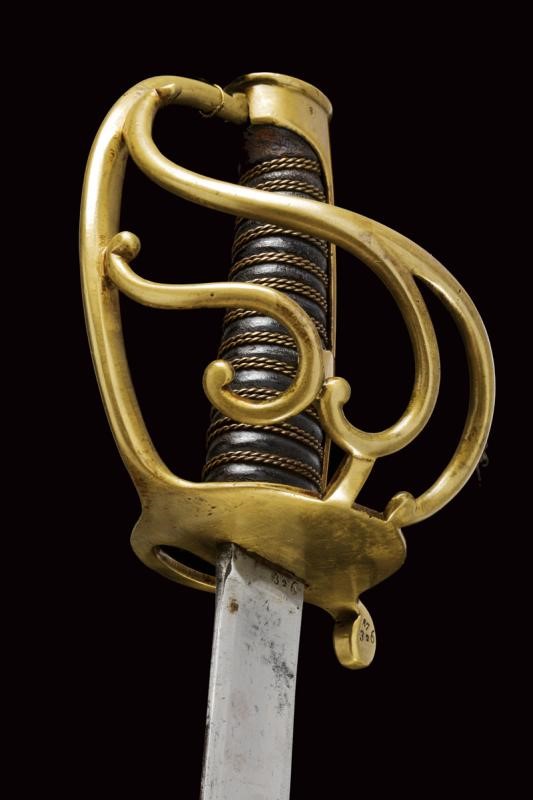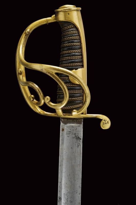 Straight, tipped, single-and-false-edged blade, with fuller on almost all its length. Some small areas with pitting. Mark "326" at the tang. Brass hilt with guard provided with three additional quillons. Parry quillon marked "FP" and "326 87". Long cap marked "8" and in italics "No. 9 Sta" (?), leather-covered grip with double copper wire binding. Without scabbard. According to the owner a sword of the Italic Kingdom reused as a weapon of the Noble Guard.